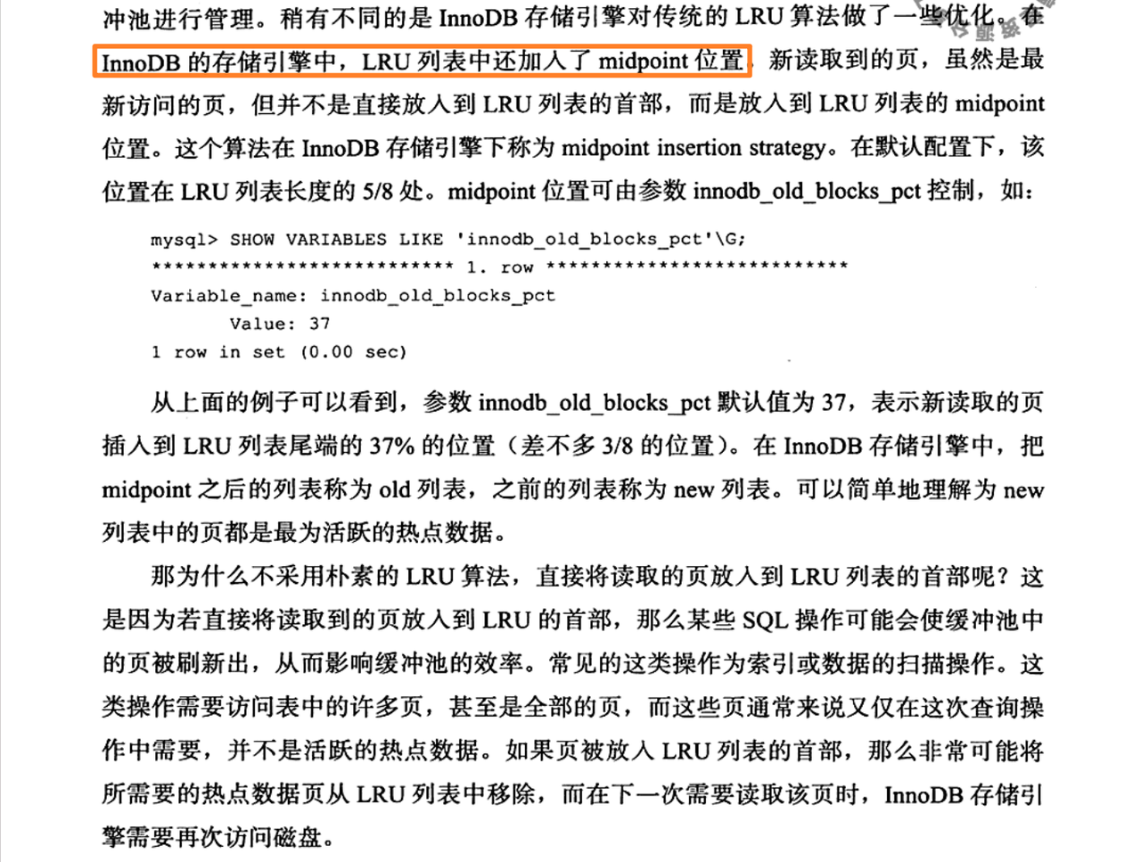 midpoint位置,默认在列表长度的 37% 处(可通过innodb_old_blocks_pct参数调整)。 -