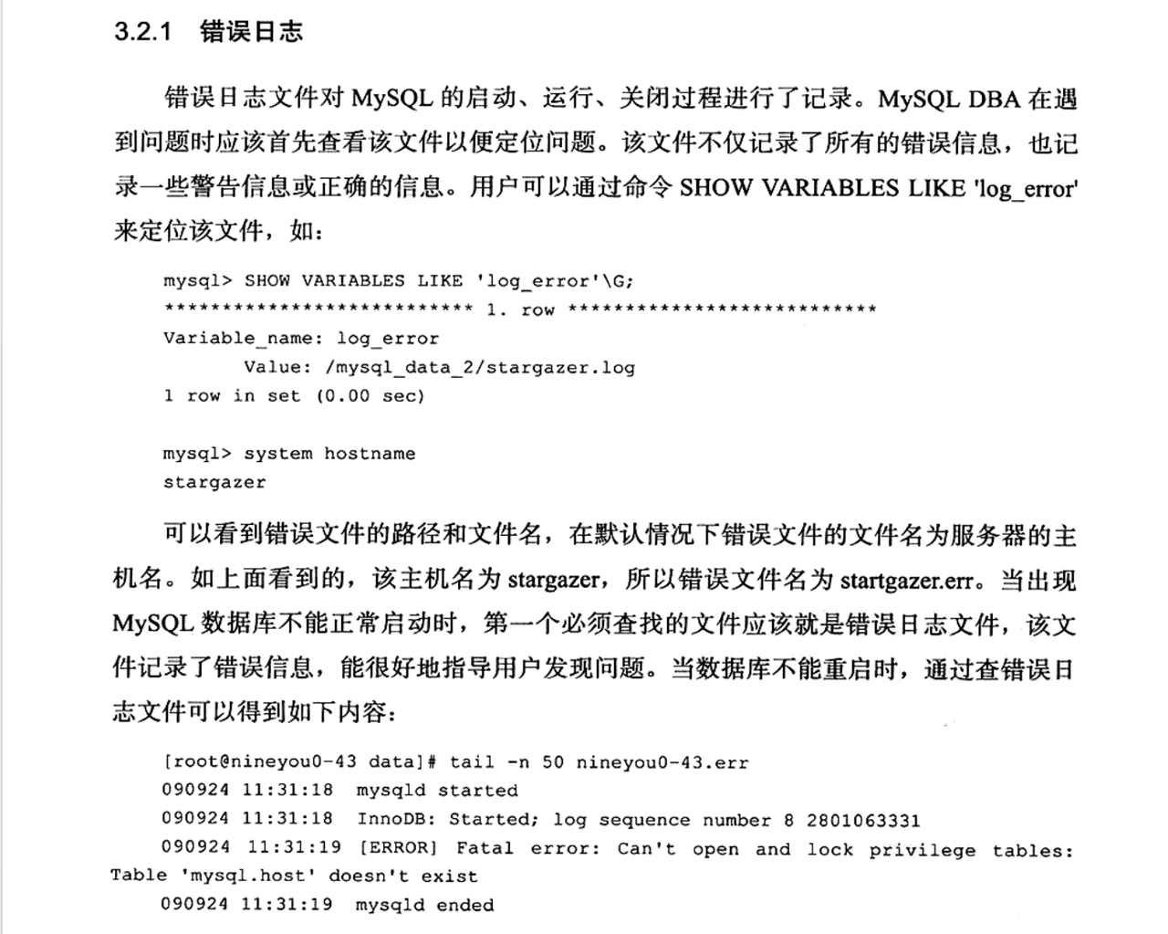 SHOW VARIABLES LIKE 'log_error'可以直接获取错误日志的存储路径和文件名,例如图中的结果为/mysql_data_2/stargazer.log。 -