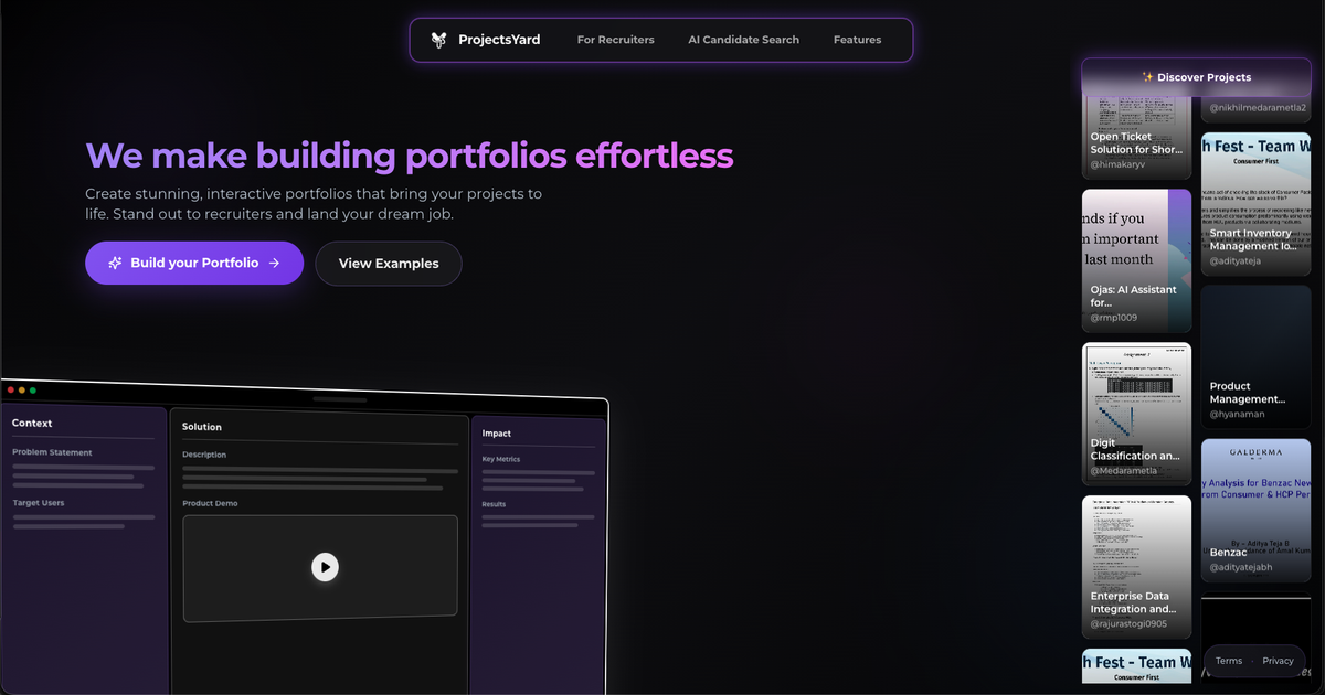 介绍:ProjectsYard 让你在15分钟内创建可被发现的作品集。求职者可以在一个按技能分类的可搜索目录中展示真实的项目成果,而不是仅仅借助关键词。他们利用人工智能在几秒钟内将简历和演示文稿转化为结构化的STAR展示。招聘人员可以进行语义搜索,直接粘贴职位描述寻找匹配的候选人,并通过标准化的格式和匹配分数来对比候选人。ProjectsYard 用技能优先的方式取代了分散的作品集,构建了一个更高效的人才层。