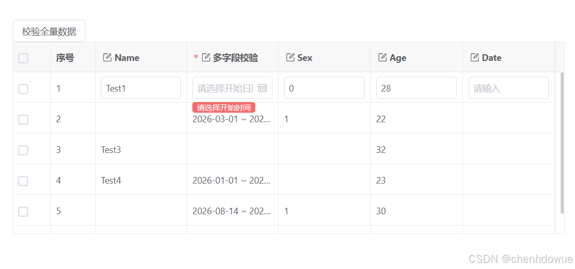 { field: '_startAndEnd', title: '多字段校验', editRender: { name: 'VxeDateRangePicker', startField: 'startDate', endField: 'endDate' } },