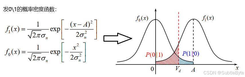 P ( 0 ∣ 1 ) = 1 2 + 1 2 erf ( V d − A 2 σ n ) P(0|1) = \frac{1}{2} + \frac{1}{2} \text{erf}\left( \frac{V_d - A}{\sqrt{2}\sigma_n} \right) P(0∣1)=21+21erf(2 σnVd−A) - 发0判1的概率: