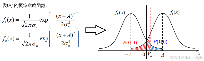 P ( 0 ∣ 1 ) = ∫ − ∞ V d f 1 ( x ) d x = 1 2 + 1 2 erf ( V d − A 2 σ n ) P(0|1) = \int_{-\infty}^{V_d} f_1(x) dx = \frac{1}{2} + \frac{1}{2} \text{erf}\left( \frac{V_d - A}{\sqrt{2}\sigma_n} \right) P(0∣1)=∫−∞Vdf1(x)dx=21+21erf(2 σnVd−A) -