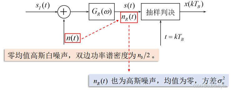 其中,由于接收滤波器又是一个线性网络,所以 n R ( t ) n_R(t) nR(t)也是零均值高斯噪声