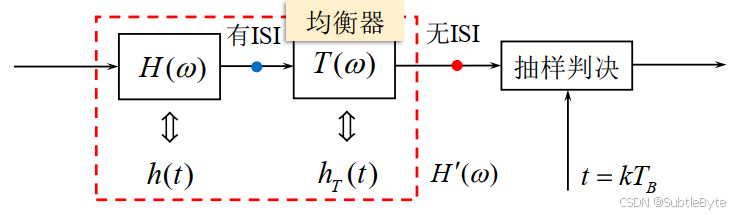 在基带系统和抽样判决器之间级联均衡器。均衡器为可调或不可调的滤波器,用于校正或补偿系统特性,减小码间干扰