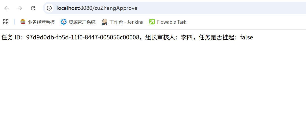 info = "任务 ID:" + task.getId() + ",组长审核人:" + task.getAssignee() + ",任务是否挂起:" + task.isSuspended();