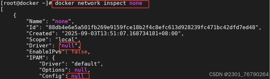 none 网络的 driver 类型是 null,IPAM 字段为空。挂在 none 网络上的容器只有 lo, 无法与外界通信。