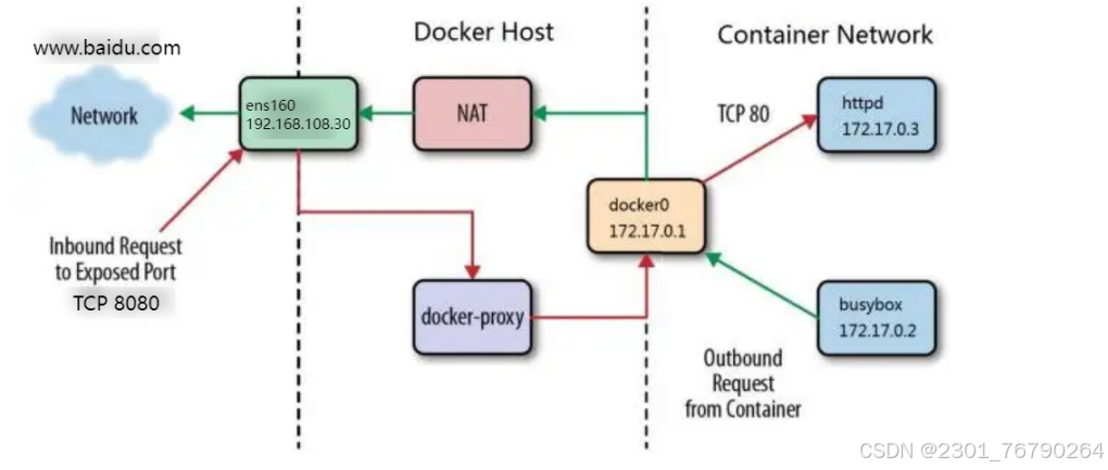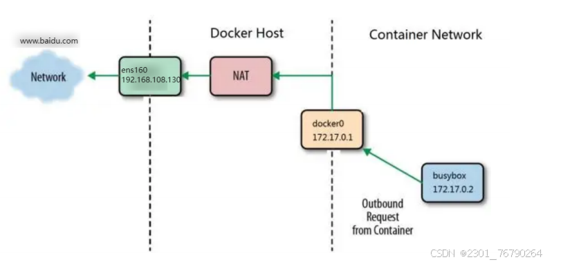 Container (172.17.0.2) → docker0 → iptables NAT(替换源 IP 为 192.168.108.30) → ens160 → 外网(www.baidu.com)
