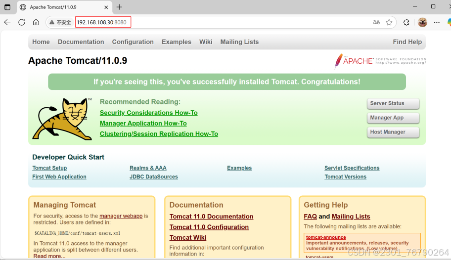 刷新 http://192.168.108.30:8080,成功显示 Tomcat 首页。