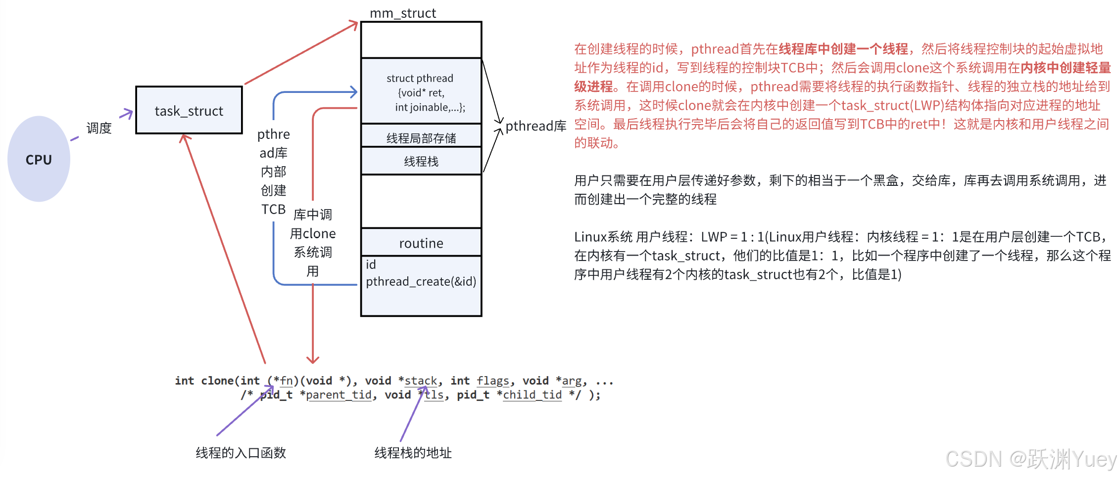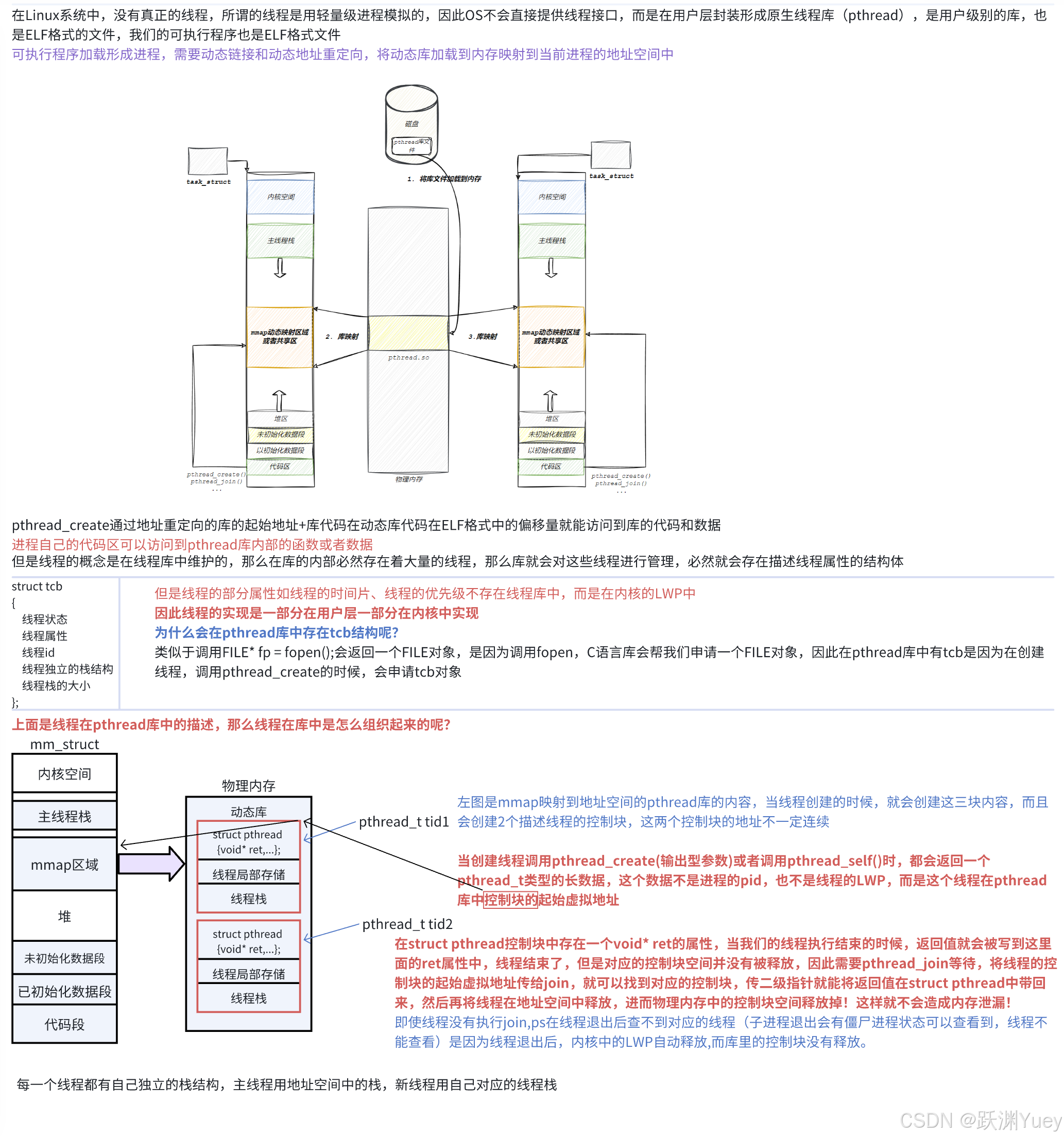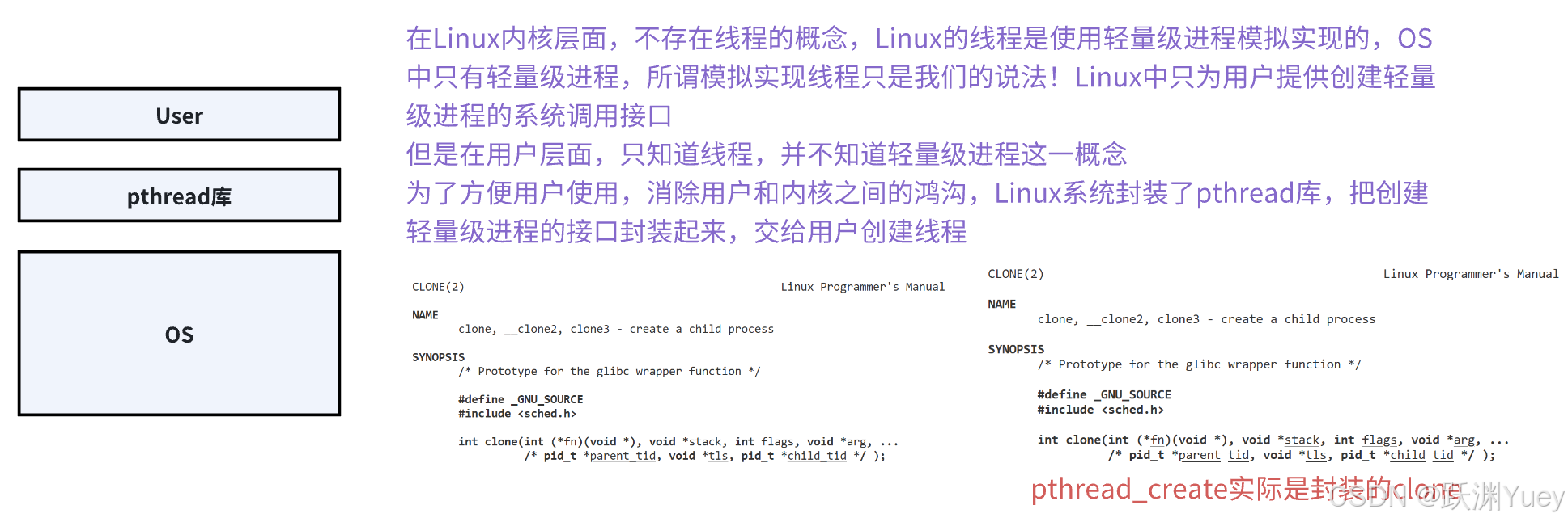 Linux所有的线程都在库中实现,不同进程的线程之间不能互相访问,因为进程的地址空间不一样