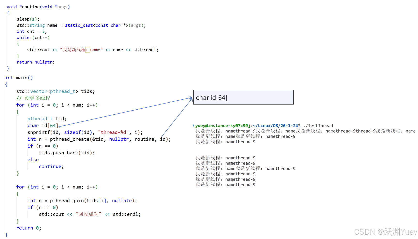 因为每次传给新线程的是id的起始地址,而在for循环每次进行的时候,id数组不会重新创建而是会重写覆盖掉原来的数组内容,因此在新进程sleep的时候,原来的数据被覆盖掉了,即使将id写成全局的数组也没办法改变这一情况。