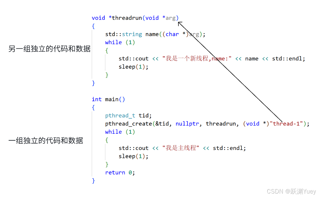 新线程执行的threadrun的起始地址就是新线程的入口地址,main函数的地址就是主线程的入口地址,两个线程执行各自的代码!