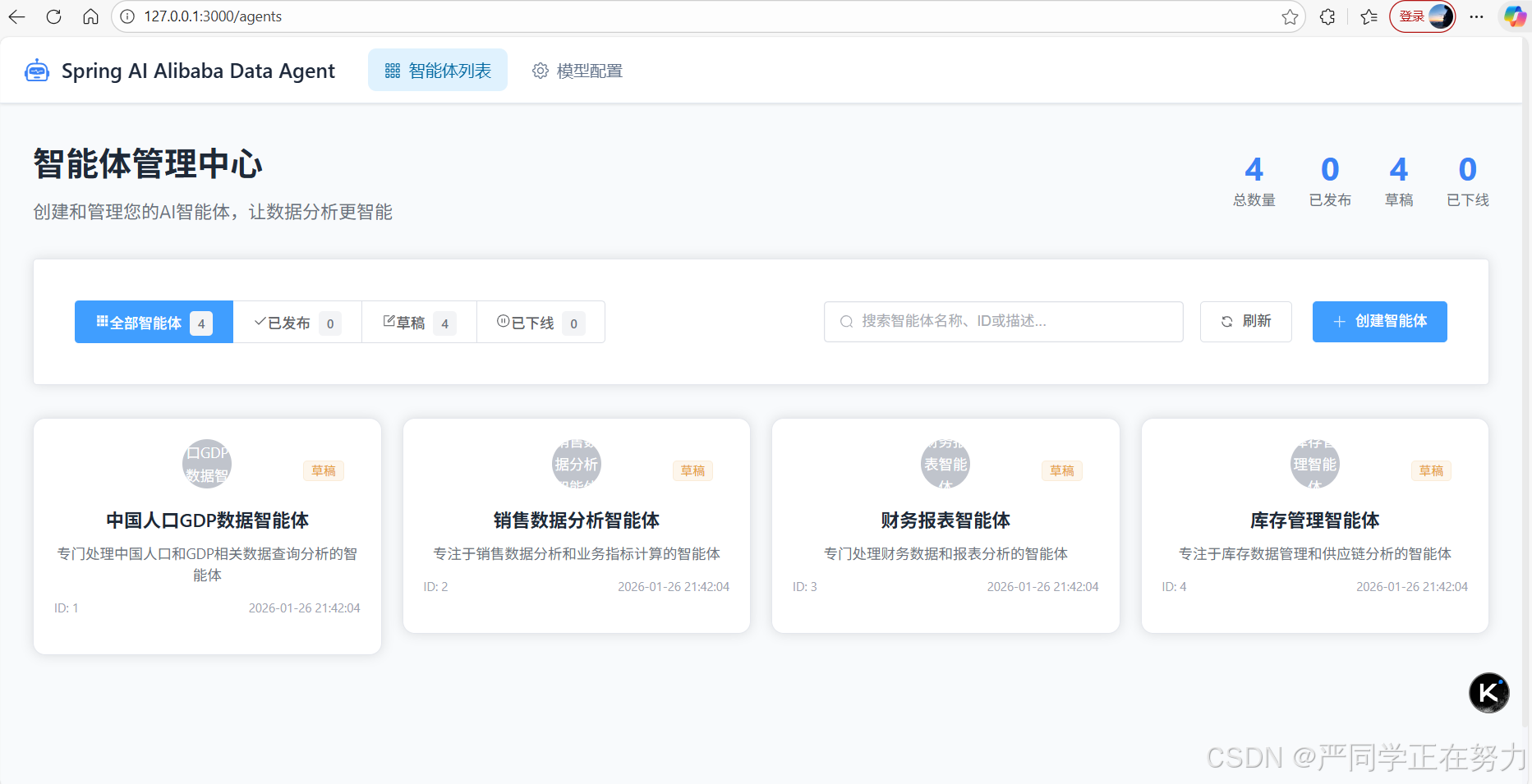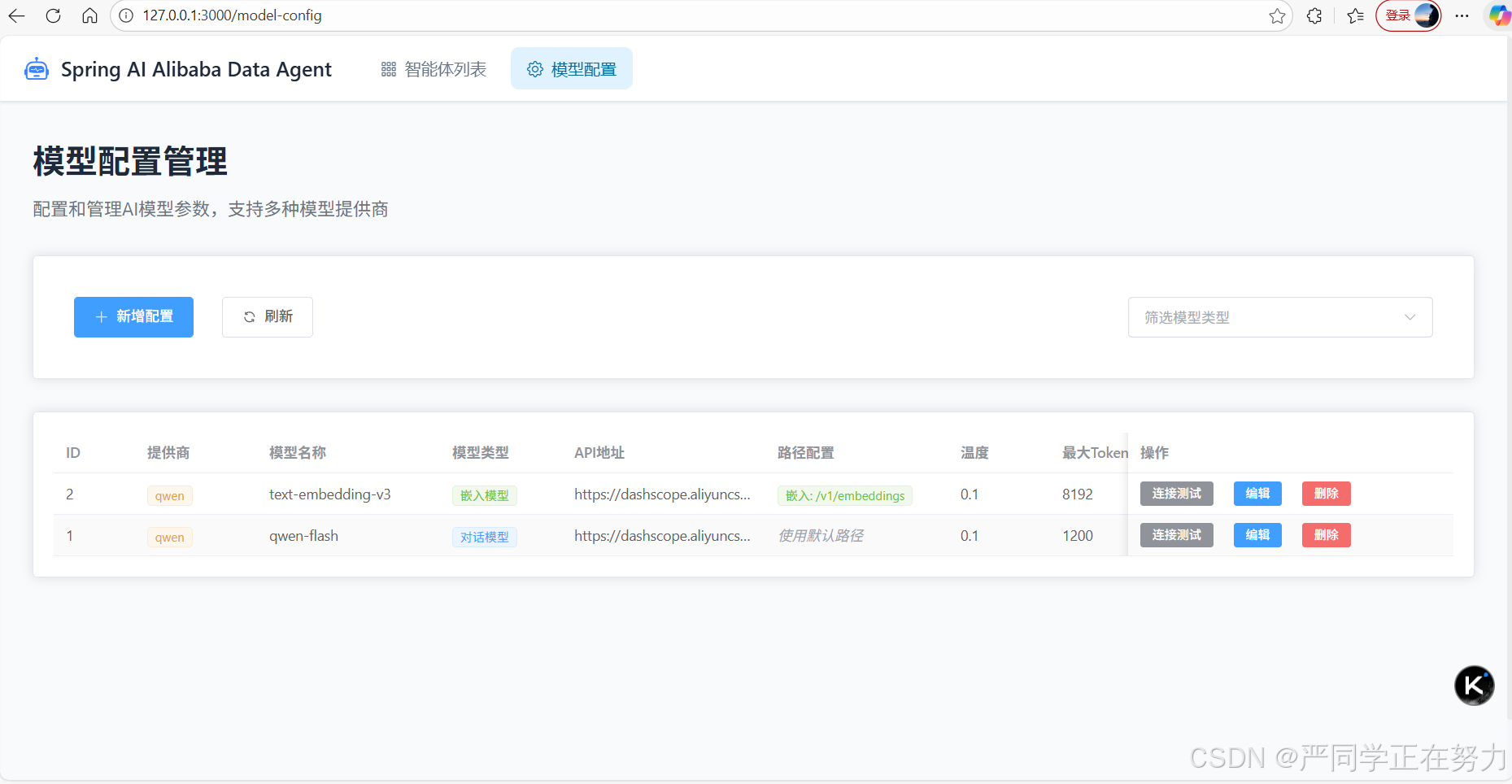 配置填好,点击连接测试,测试通过即可点击查看智能体列表了