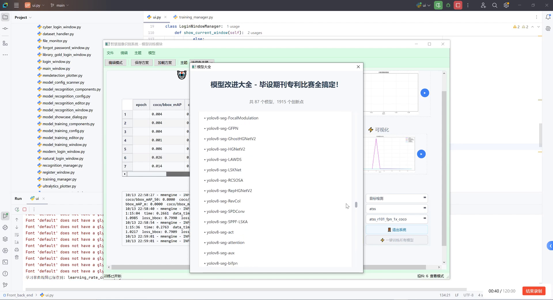 图片展示了一个基于Python的模型训练与管理界面,核心是"模型改进大全"弹窗,包含87个YOLOv8-seg系列分割模型(如FocalModulation、GFPN等),用于工业仓储空盒检测需结合语义分割技术。背景可见训练日志(含coco/bbox_mAP指标)、模型性能表格(epoch与mAP对应关系),右侧有可视化图表与"退出系统"按钮。这些元素表明该工具支持模型选择、训练监控与结果分析,为空盒检测提供算法支撑------通过分割模型识别空盒轮廓,结合分类逻辑实现自动化检测与分类,是工业场景中空盒处理的关键技术环节。