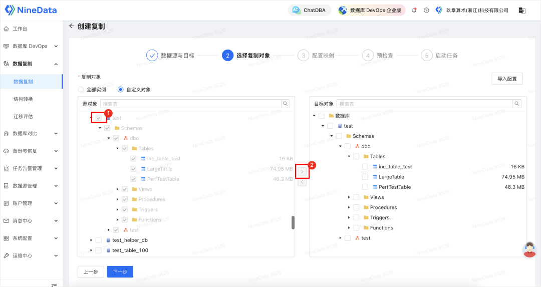 - 选择需要复制的数据库对象(库/Schema/表/列)。