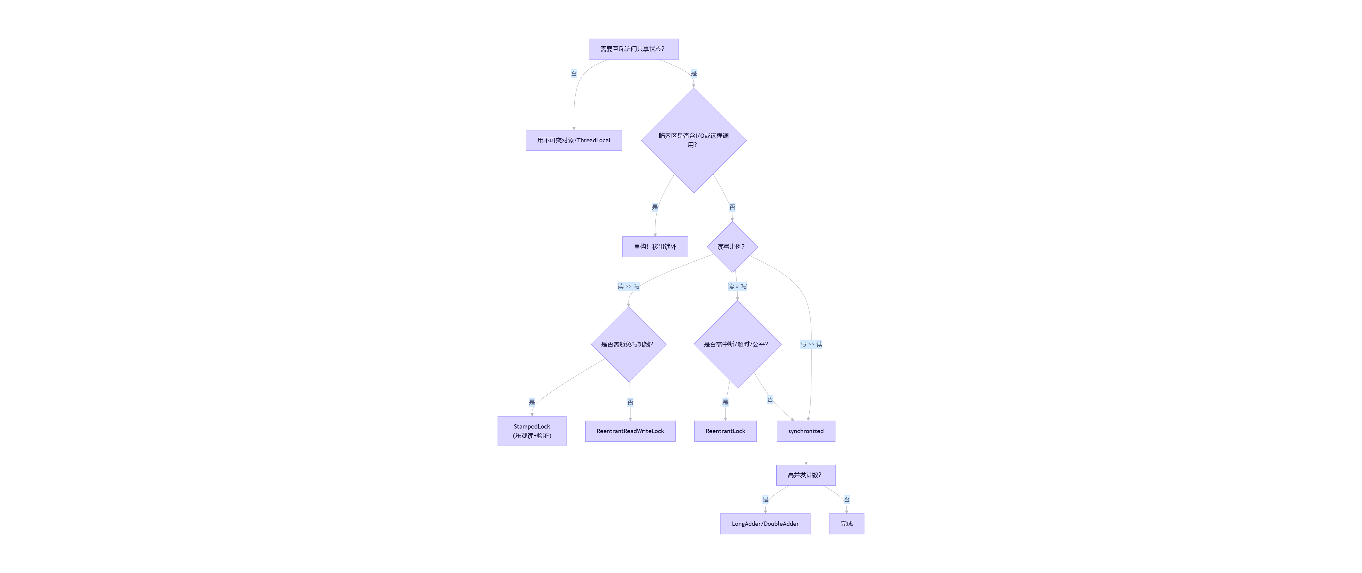 | 需要互斥访问共享可变状态? | → 是:选锁;否:考虑不可变对象/线程局部变量 |