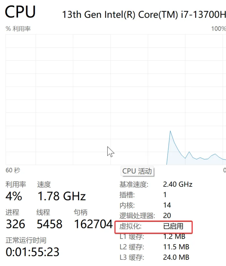 打开 任务管理器 -> 性能 -> CPU,查看虚拟化是否开启