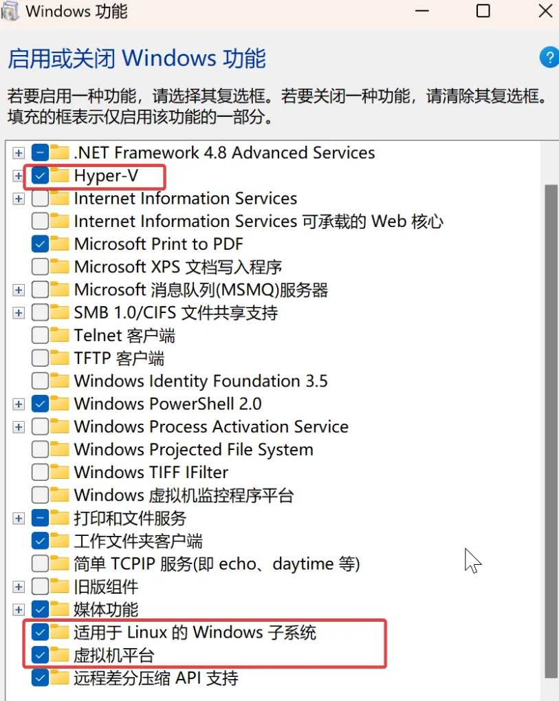 - [总结:只需要打开这两个:适用于 Windows 的 Linux 子系统,虚拟机平台,不需要要打开 Hyper-V](#总结:只需要打开这两个:适用于 Windows 的 Linux 子系统,虚拟机平台,不需要要打开 Hyper-V)
