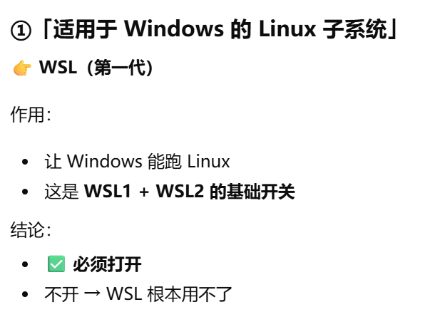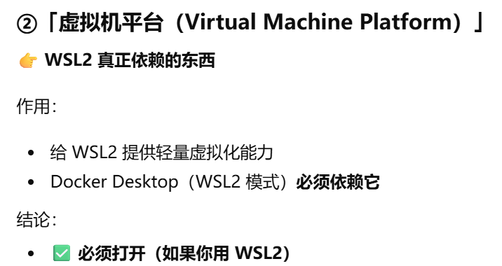 「虚拟机平台(Virtual Machine Platform)」,必须打开,WSL2 真正依赖的东西