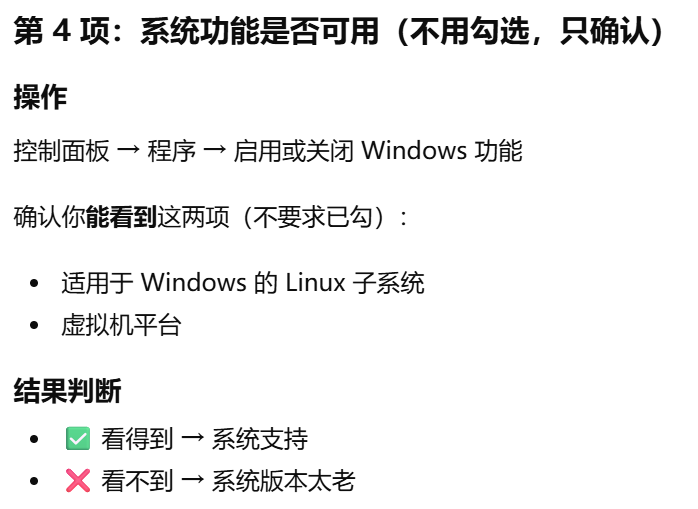 - [打开控制面板 -> 程序 -> 启用或关闭系统功能。还需要勾选虚拟机平台,HyperV等吗?好多博客都有](#打开控制面板 -> 程序 -> 启用或关闭系统功能。还需要勾选虚拟机平台,HyperV等吗?好多博客都有)