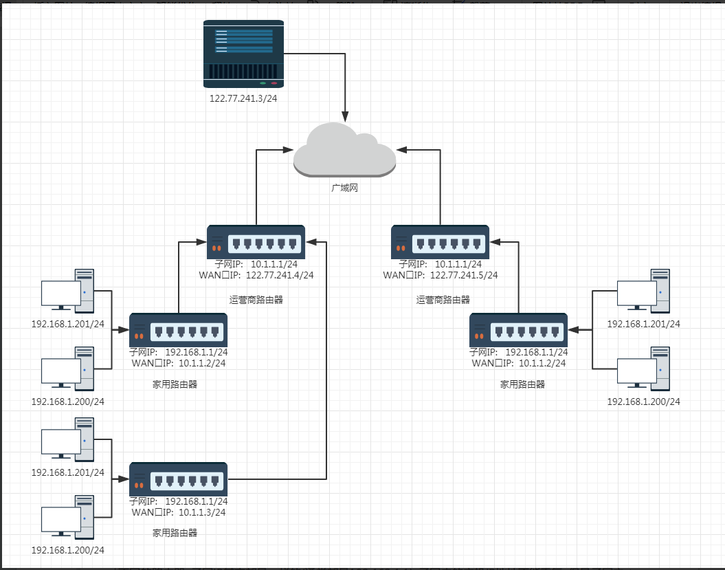每一个家用路由器,其实又作为运营商路由器的子网中的一个节点;这样运营商路由器可能会有很多级,最外层的运营商路由器,WAN口IP一定是一个公网IP了。