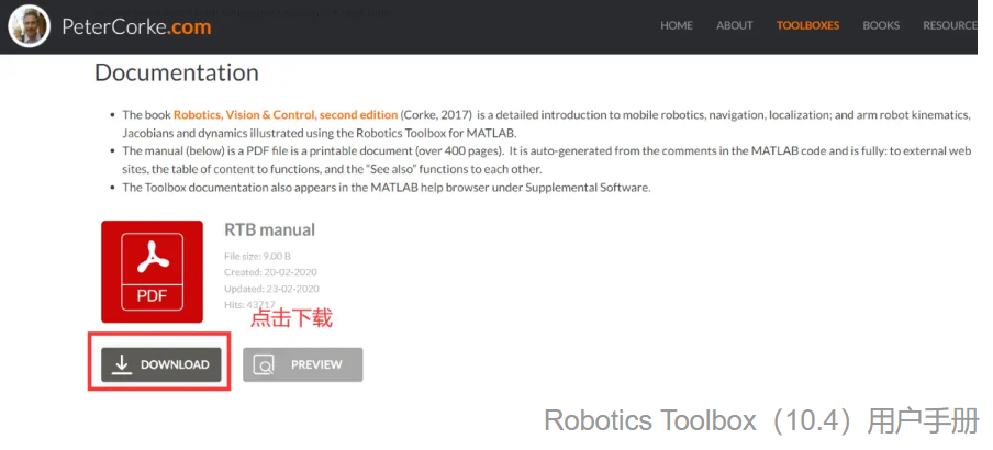 1.1、进入官网:https://petercorke.com/toolboxes/robotics-toolbox/
