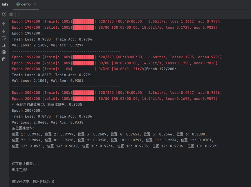 模型完成了全部200个周期的训练。最终的验证集准确率(Val Acc)达到了93.35%,表明模型具有很强的泛化能力。各位置识别能力均衡且强大:详细的"各位置准确率"分析显示,模型对身份证号码18个位置的每一个字符都有很高的识别精度。大部分位置的准确率都接近或超过了90%,其中位置1、17、18的准确率更是超过了98%。这证明模型不是只对某些特定位置的数字敏感,而是对整个号码序列都有稳定的识别能力。