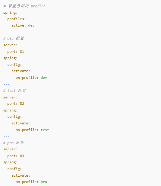 --- 分隔符 :在 application.yml 中,--- 用来分隔多个环境的配置文件段,每个段可以定义不同的配置项。当 Spring Boot 启动时,它会加载与当前激活的 profile 相关联的配置段。例如,如果激活的是 dev,Spring Boot 会加载与 dev 相关的配置,并覆盖默认配置。