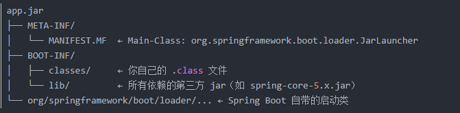 当需要加载 com.example.MyService 时,它直接去 BOOT-INF/classes/com/example/MyService.class 找;