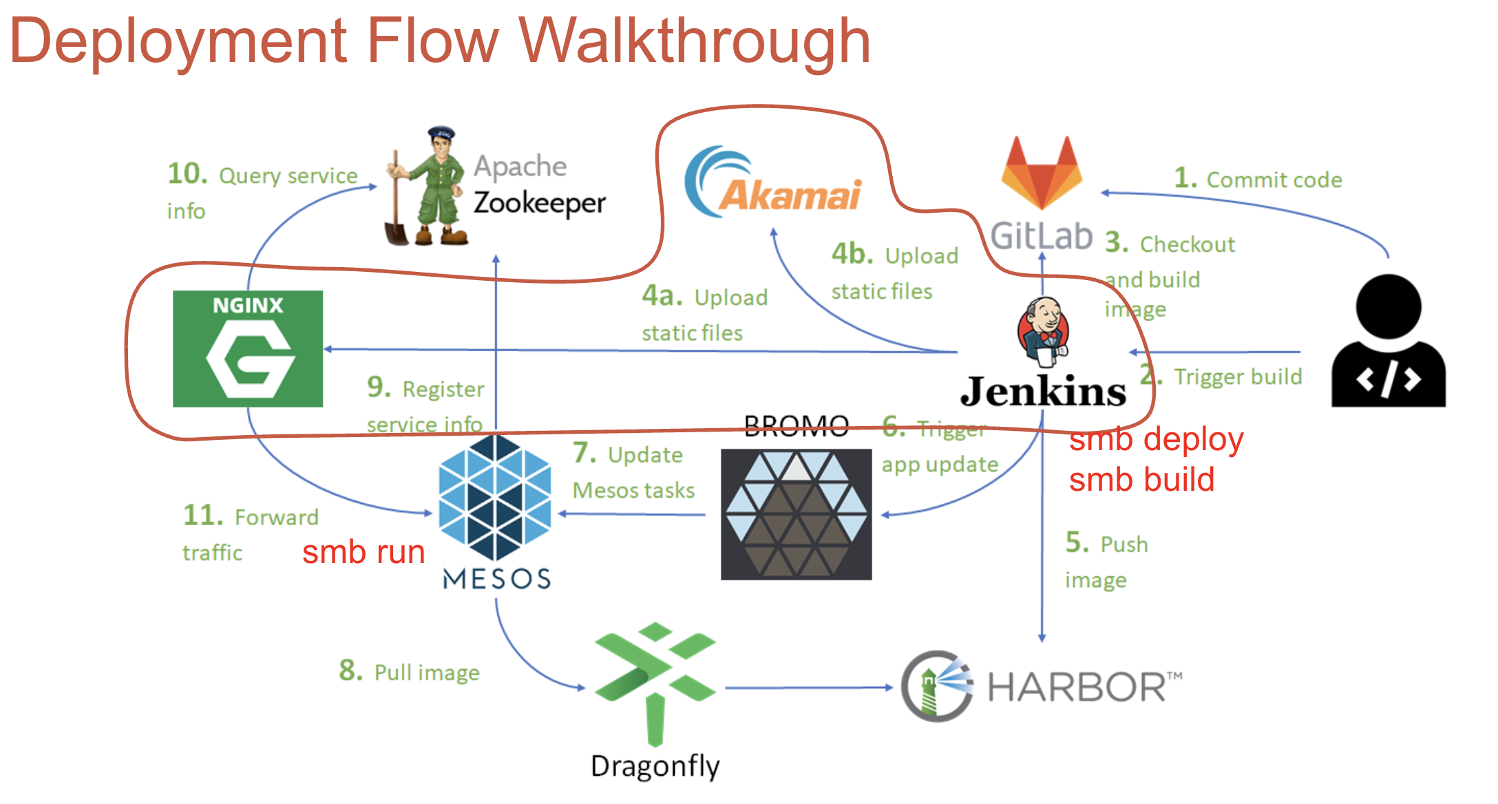开发者 → GitLab → Jenkins → [Akamai/Harbor] → BROMO → Mesos → Zookeeper → NGINX → 用户流量