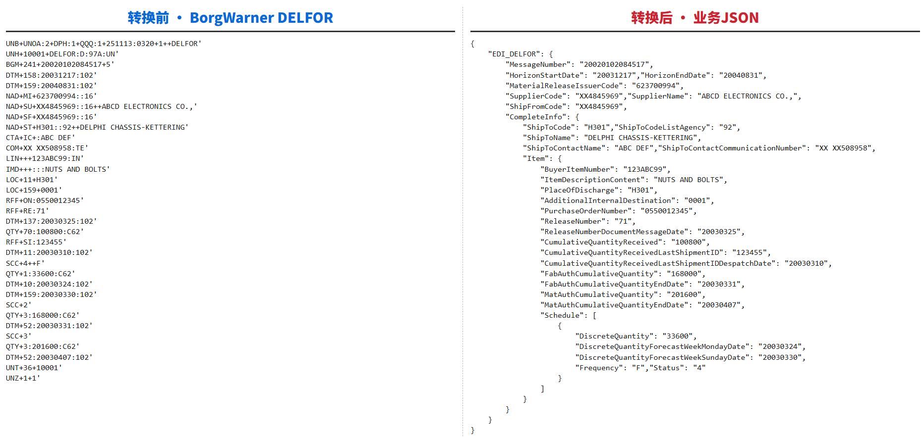 BorgWarner 提供的 DELFOR 报文承载着汽车供应链中关键的预测与计划信息,是企业进行生产排程与物料规划的重要数据来源。通过将原始 EDI 报文解析并转换为结构化 JSON 格式,预测数据能够以更直观、更易处理的方式被系统接收与利用,为后续的业务系统集成、数据分析及计划决策奠定统一的数据基础。