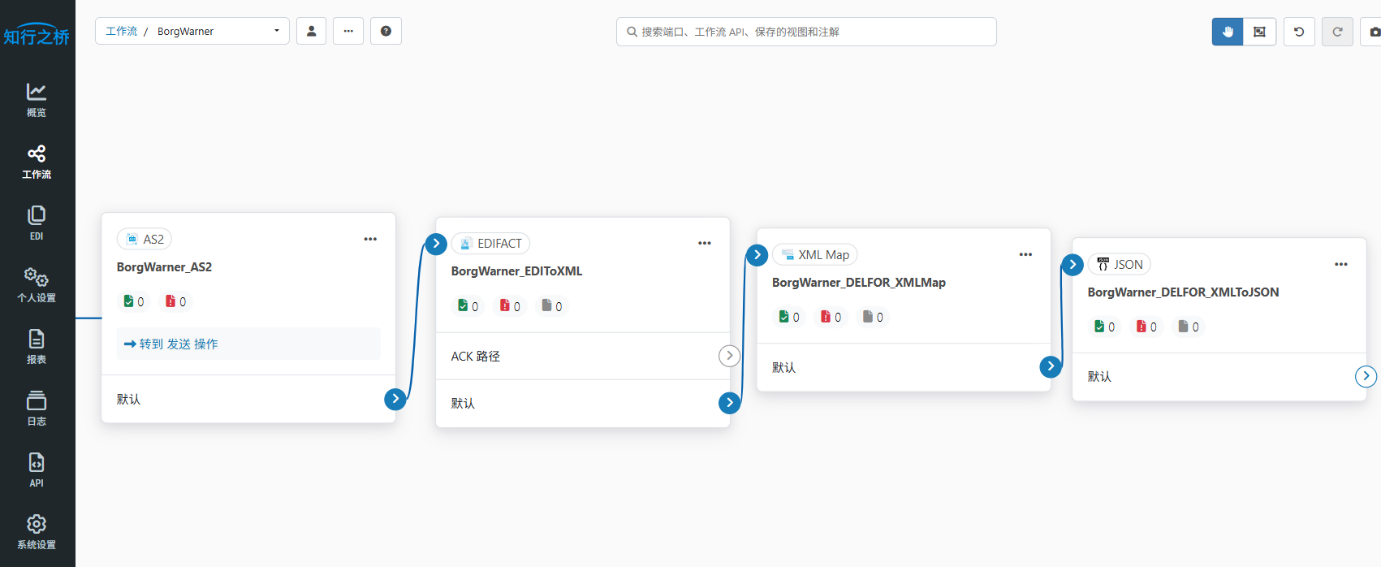 基于知行之桥 EDI 系统,可将BorgWarner的 DELFOR 报文解析并转换为 结构化 JSON 数据。在此基础上,结合系统内置的 EDIFACT 端口、XML Map 端口及 JSON 端口,实现报文解析、字段映射与数据转换的自动化处理,进而构建完整、可配置的 自动化业务工作流。