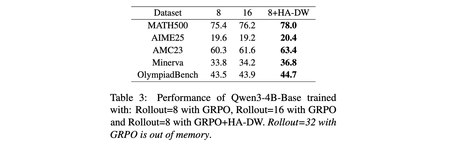 表3比较了使用8个rollouts的GRPO、16个rollouts的GRPO以及8个rollouts加HA-DW的GRPO的性能。结果显示,使用HA-DW的8个rollouts方法在所有基准上都优于16个rollouts的纯GRPO,甚至在某些指标上接近或超过32个rollouts的水平(后者因内存不足无法运行)。这证明了HA-DW在计算资源受限场景下的高效性。