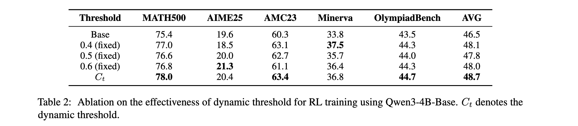 对动态阈值 C t C_t Ct的有效性进行了评估,通过在五个基准上将其与固定阈值进行比较,如表2所示。在Qwen3-4B-Base上使用基于GRPO的训练的实验表明,动态调整实现了最佳性能。移除 C t C_t Ct会降低性能,而固定阈值仍然通过部分缓解偏差估计而优于基线。通过整合跨批次信息, C t C_t Ct捕获长期奖励信号并进一步增强RL性能。
