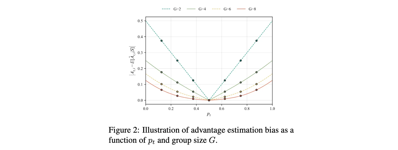定理1清晰地展示了群体相对优势估计器的期望偏差方向:对于困难问题( p t < 0.5 p_t \lt 0.5 pt<0.5),该估计器的期望低于真实优势;对于简单问题( p t > 0.5 p_t \gt 0.5 pt>0.5),则高于真实优势。该估计器仅在 p t = 0.5 p_t = 0.5 pt=0.5时是无偏的。随着 p t p_t pt偏离 0.5 0.5 0.5且 G G G越小,这种偏差会放大,如图2所示。