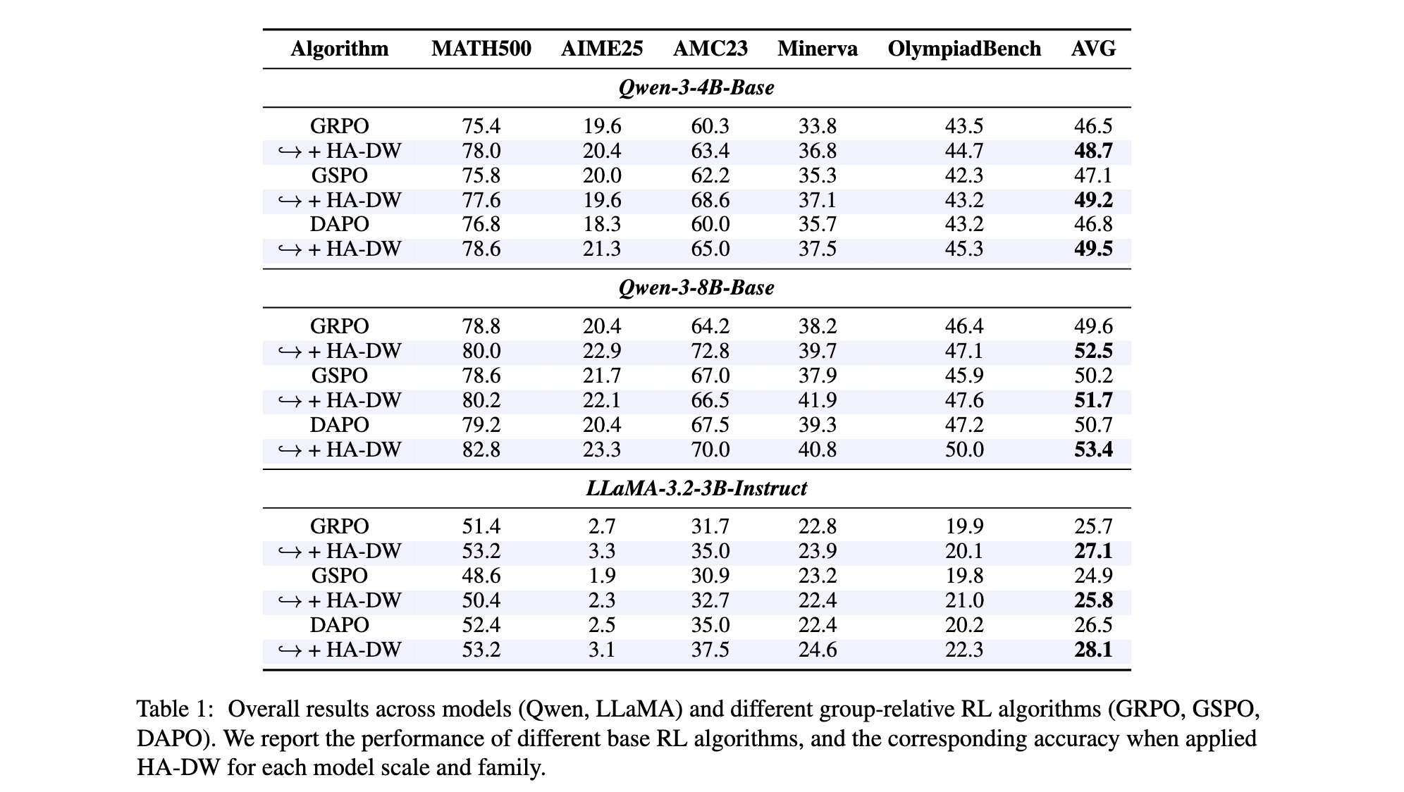 这一工作的意义在于,它不仅发现了一个被长期忽视的理论问题,还提供了一个简单而有效的解决方案。HA-DW可以作为即插即用的模块集成到现有的群体相对RL算法中,无需大幅修改现有训练流程,就能获得稳定的性能提升。这对于在实际应用中部署RLVR具有重要的实用价值。