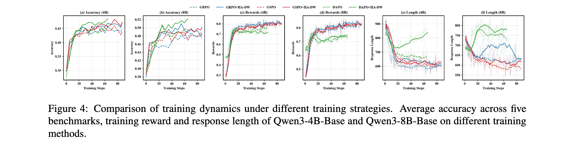 在Qwen3-4B-Base、Qwen3-8B-Base和LLaMA-3.2-3B-Instruct上进行了实验,评估不同算法在五个常用RLVR基准上的数学推理性能。将提出的HA-DW方法应用于几种代表性的群体相对强化学习算法:GRPO、GSPO和DAPO。比较应用HA-DW的群体相对算法与原始方法的性能,验证了方法的有效性和可扩展性。在VeRL框架内,使用单个节点的8块NVIDIA A100 GPU进行RL训练。