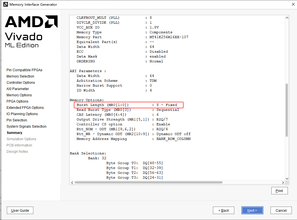 图中显现的是 Memory Interface Generator (MIG) 的配置摘要。红框中的 "Burst Length (MR0[1:0]) : 8 - Fixed" 是 DDR3 物理层的一个核心参数。: