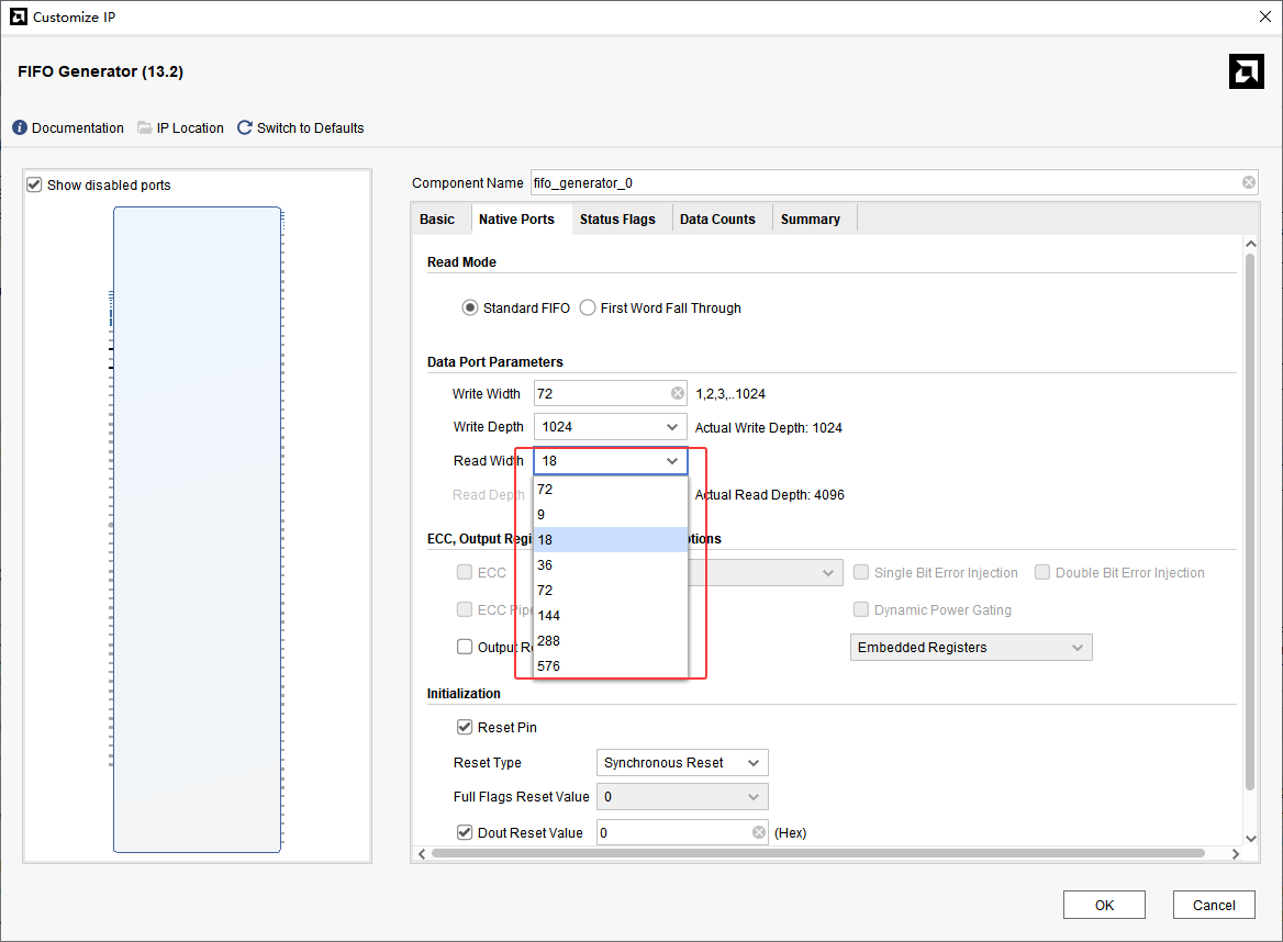 以上这两种方案都会浪费空间,增加存储的数据量。因此还需要更好的方案。考虑过将FIFO设计为72位写入,64位读出,但是vivado的FIFO IP核只能是2的倍数关系,如下图所示: