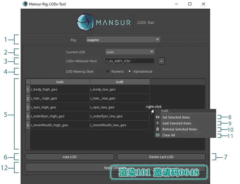 🎛️ **丰富辅助工具:**包括自定义动画控制界面(Animation Picker)、LOD(细节层级)管理工具等,提升绑定调试与动画制作效率。