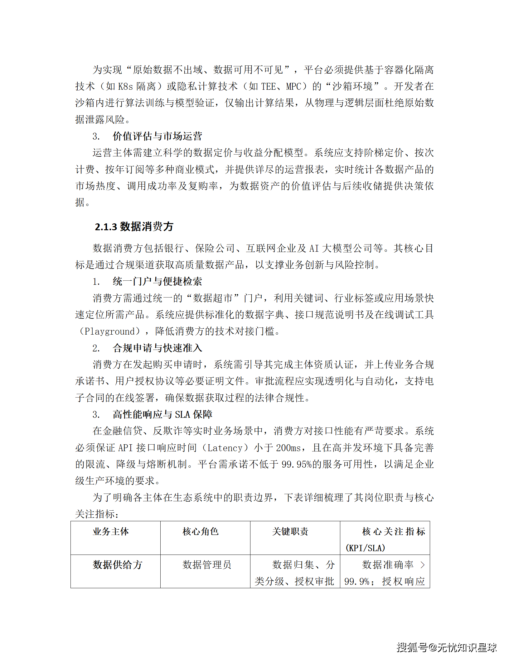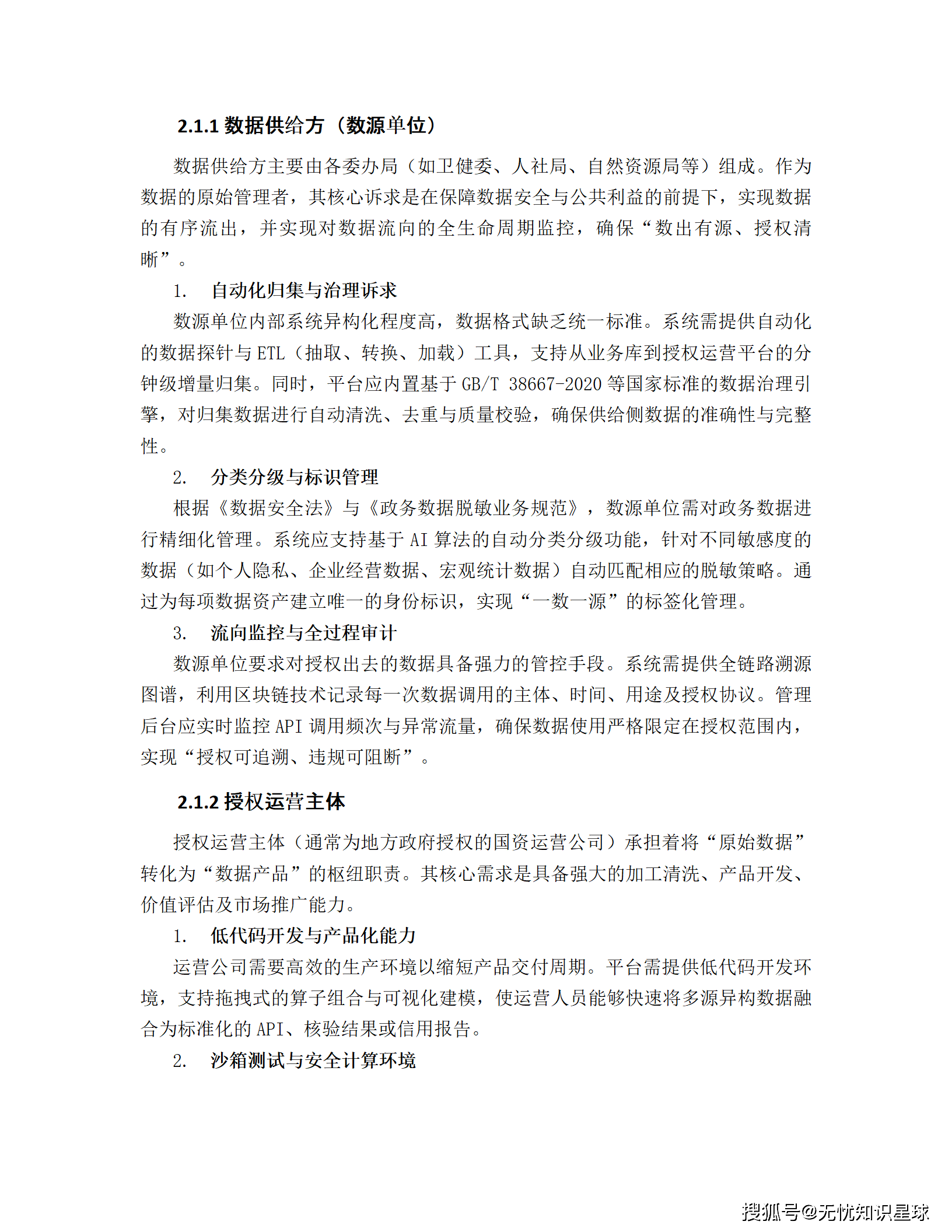 - 授权运营主体 :通常为地方政府授权的国资运营公司。核心诉求 :具备强大的加工清洗、产品开发、价值评估及市场推广能力。功能预期:低代码开发环境、安全沙箱、价值评估与市场运营工具。