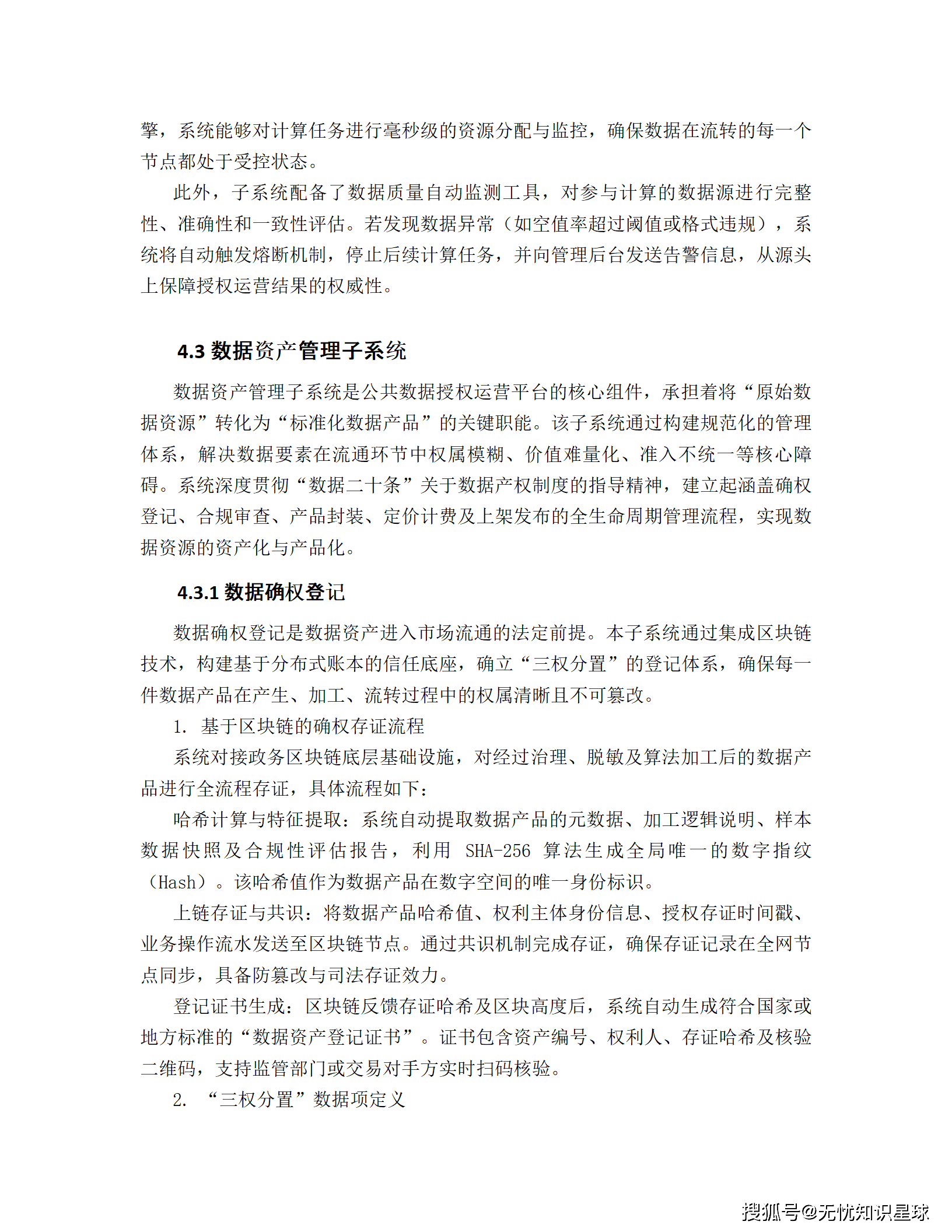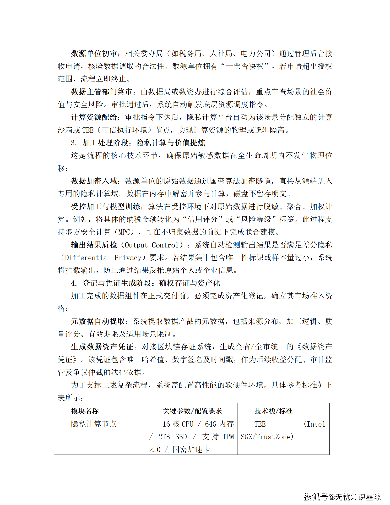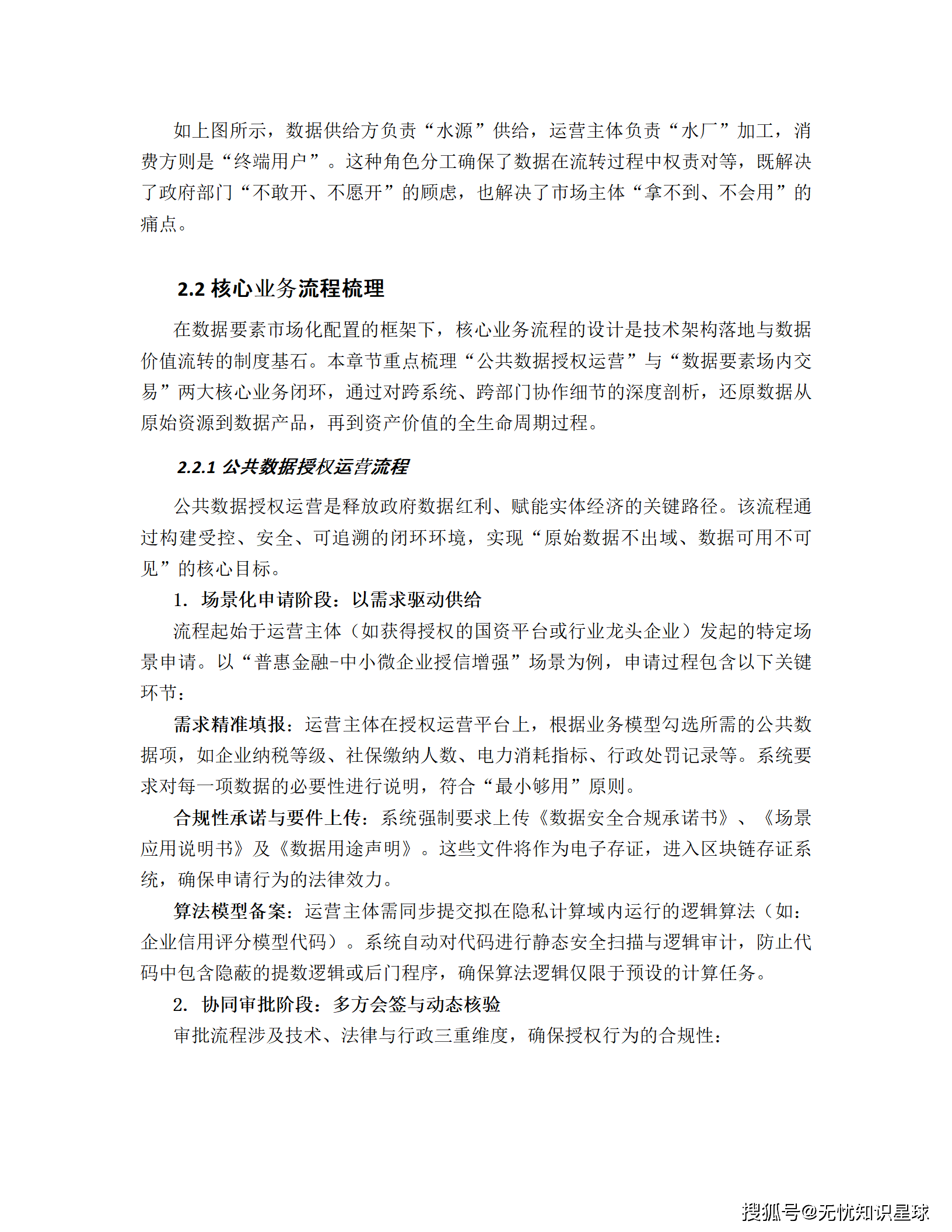 - 公共数据授权运营流程 :场景化申请 :运营主体发起特定场景申请,勾选所需数据项,并提交算法模型备案。协同审批 :数源单位初审 + 数据主管部门终审,确保授权行为合规。加工处理 :在隐私计算沙箱内,原始数据加密入域,进行受控加工,仅输出计算结果。登记与凭证生成:生成包含唯一哈希值的《数据资产凭证》,上链存证,完成资产化。