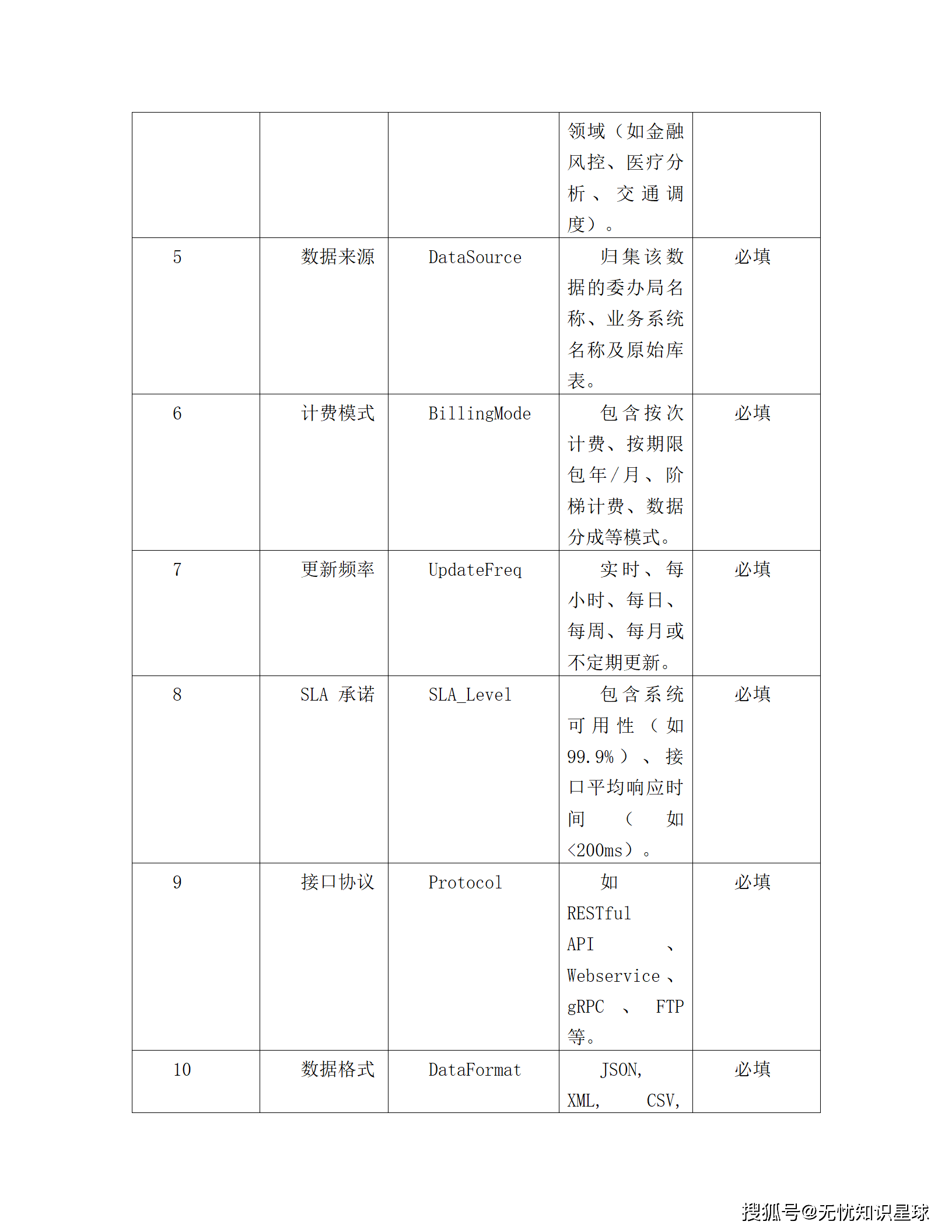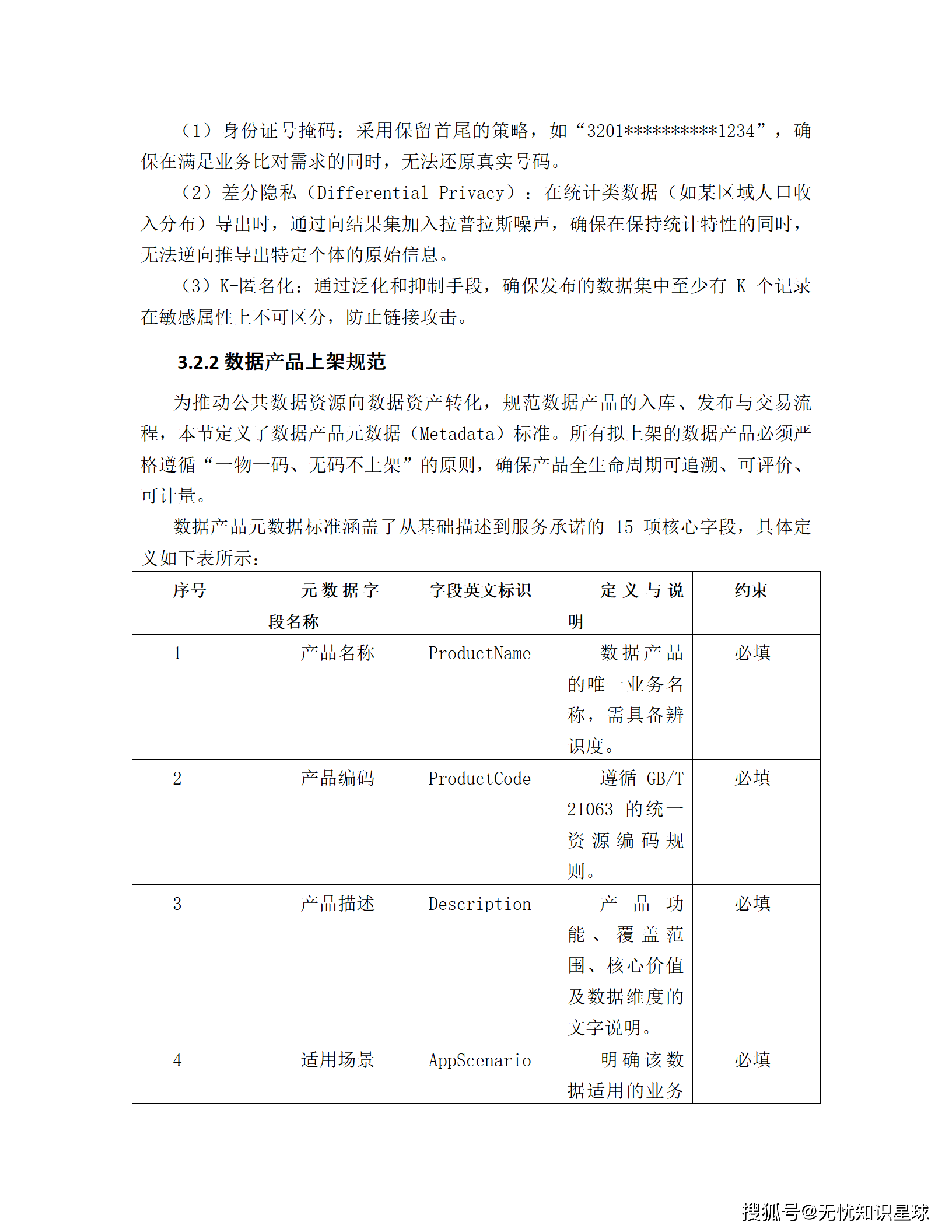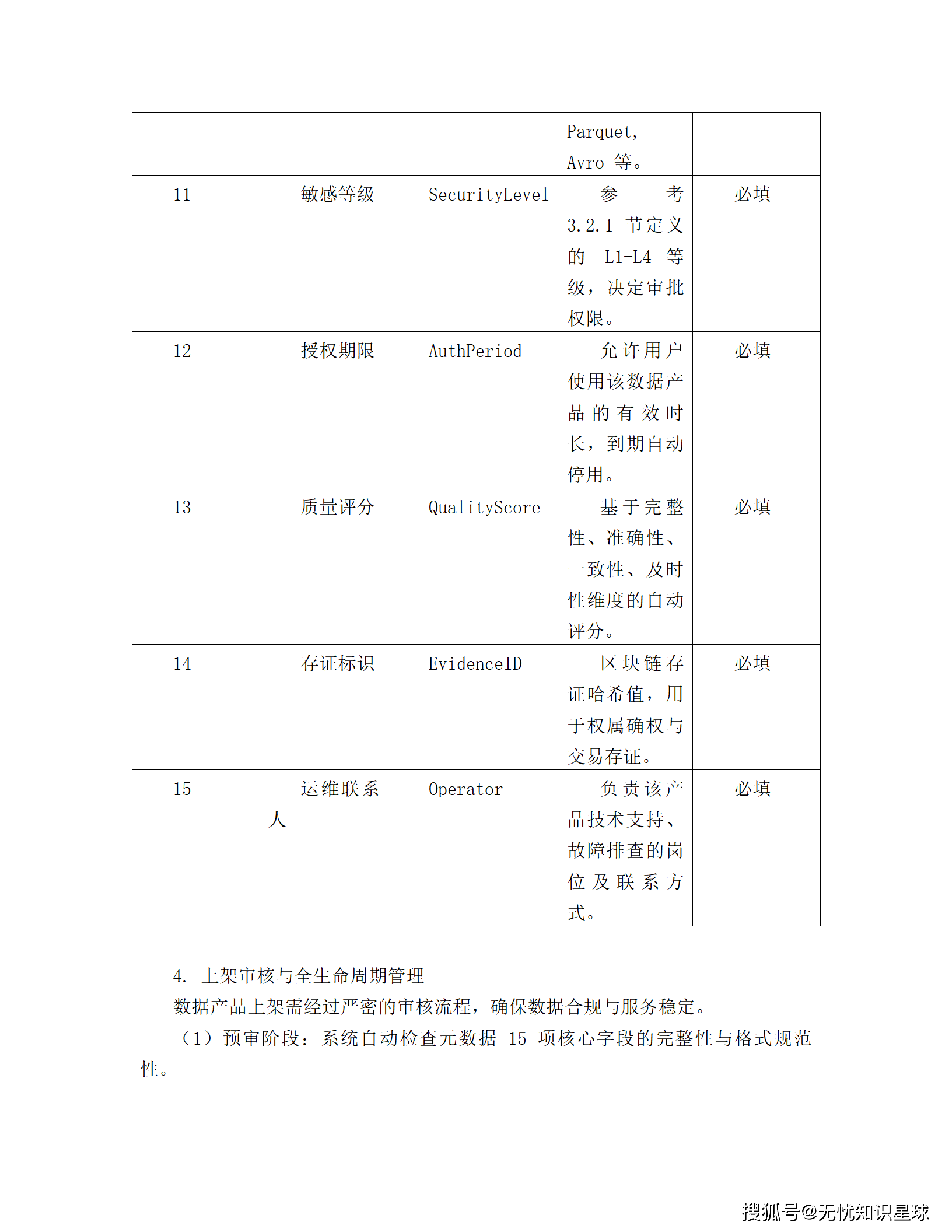 所有拟上架的数据产品必须遵循"一物一码、无码不上架"的原则。方案定义了包含产品名称、编码、描述、适用场景、数据来源、计费模式、更新频率、SLA承诺、敏感等级等在内的15项核心元数据字段,确保产品全生命周期可追溯、可评价。