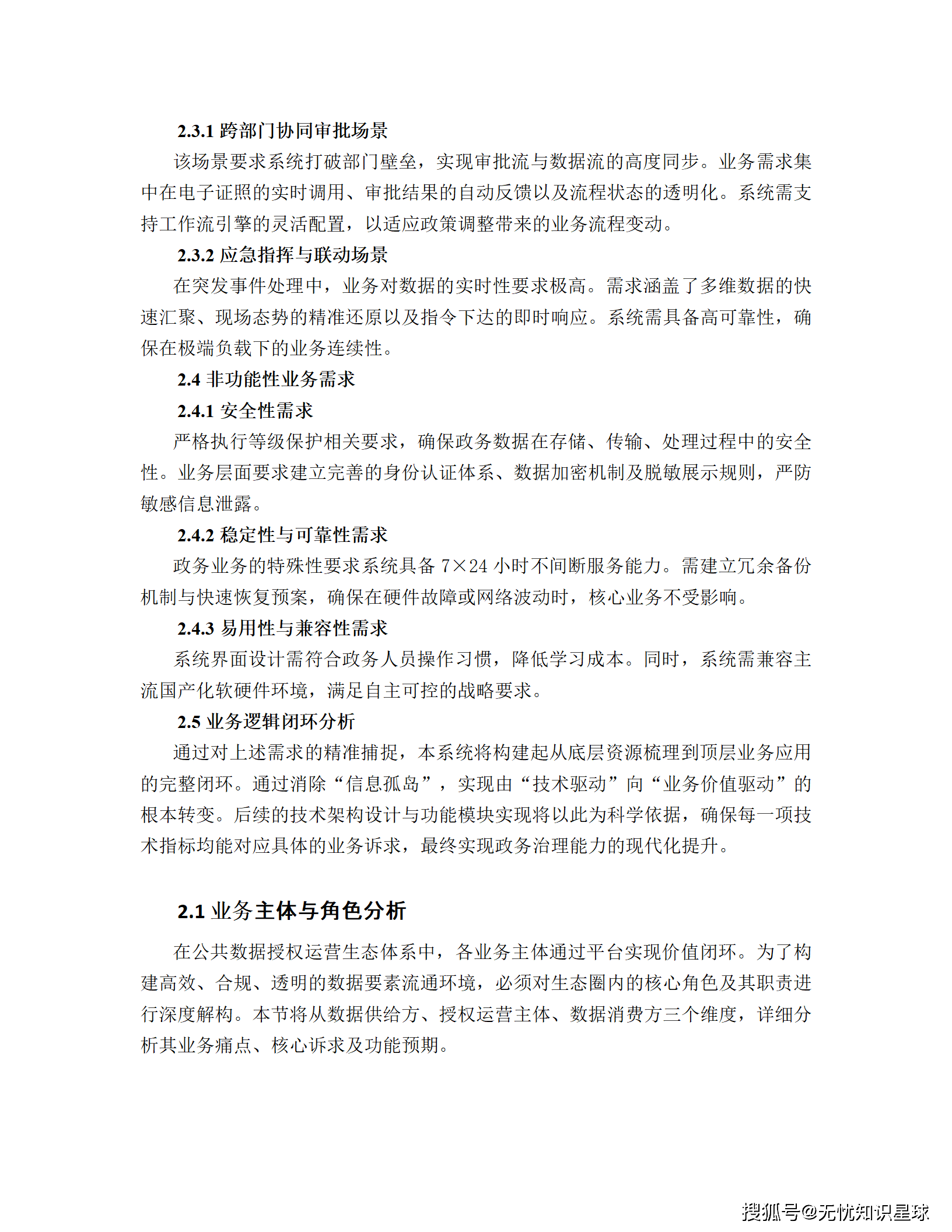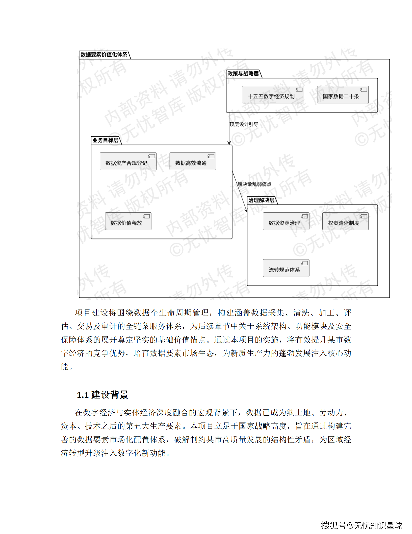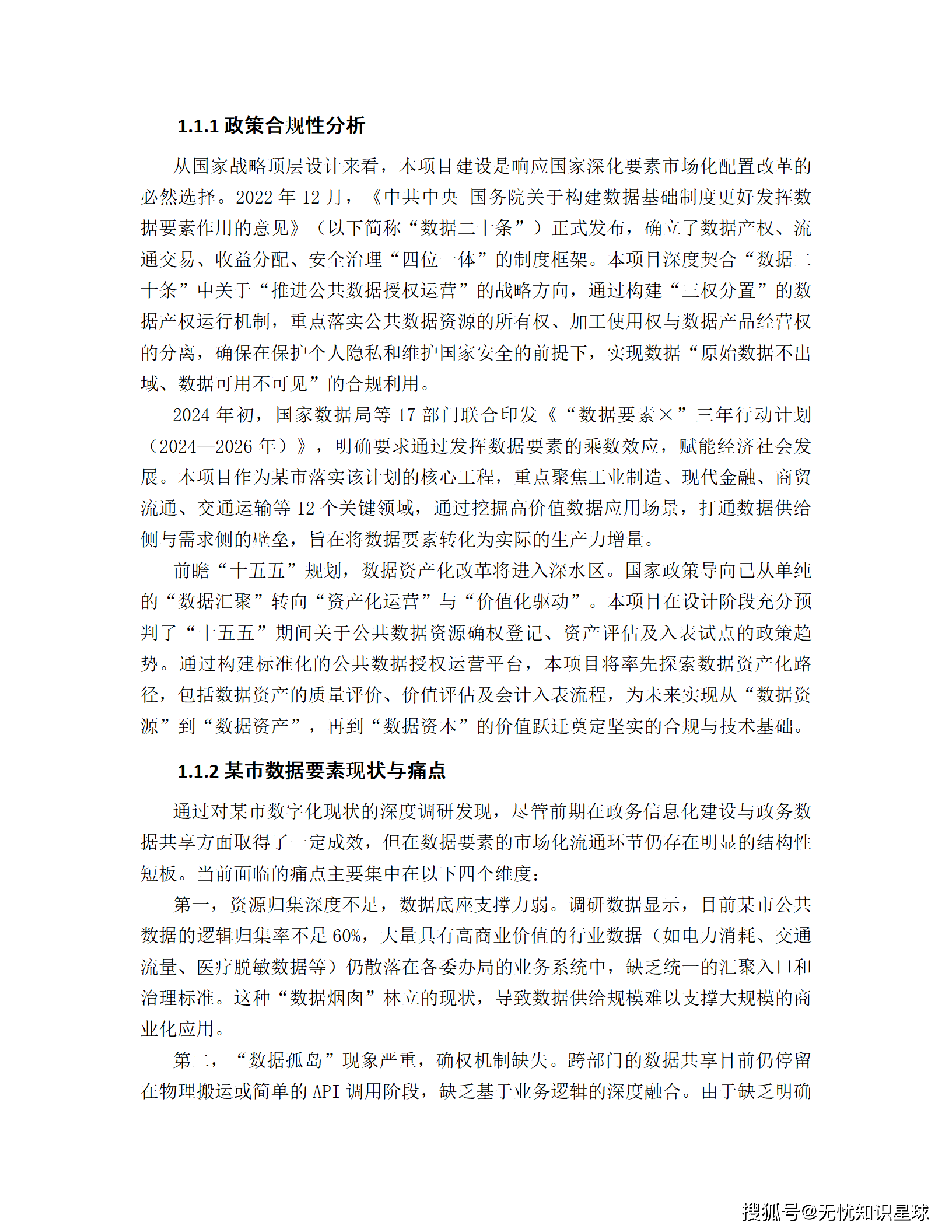 - 国家战略层面:"数据二十条"确立了数据产权、流通交易、收益分配、安全治理"四位一体"的制度框架,并明确提出要推进公共数据授权运营。这为项目提供了根本遵循。