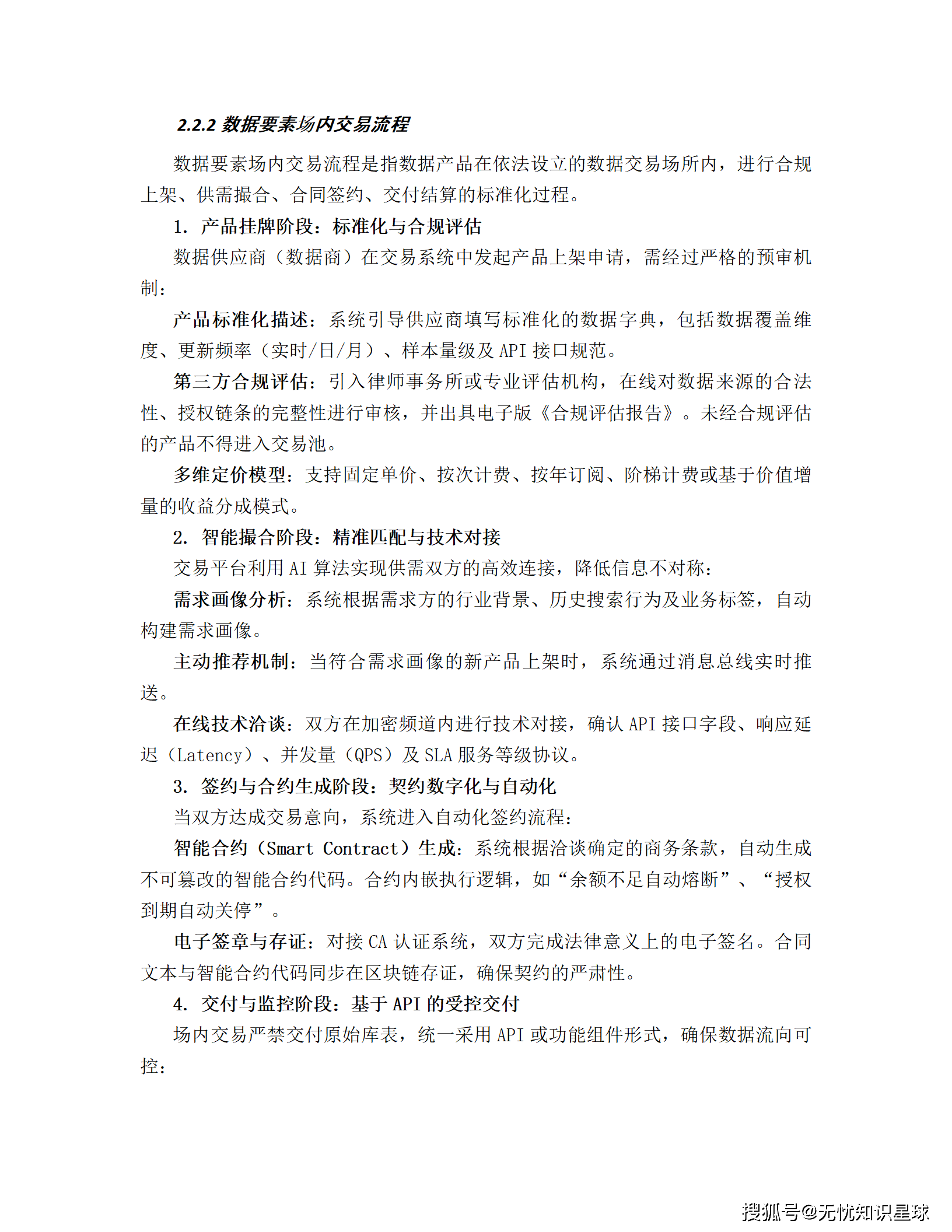 - 数据要素场内交易流程 :产品挂牌 :数据商提交产品,经过标准化描述、第三方合规评估和多维定价。智能撮合 :平台利用AI算法精准匹配供需双方。签约与合约 :自动生成并签署具有法律效力的电子合同和智能合约。交付与监控 :通过API网关进行受控交付,全链路监控流量与质量。结算与清算:自动化账单生成,银企直连清算,实现"交易-支付-开票"一体化。
