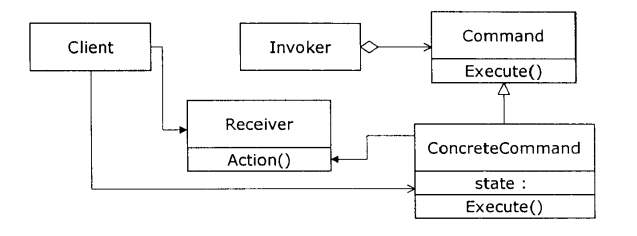 - 此后,一旦调用者认为执行时间到了,便会启动Command中的Execute虚函数。虚拟调用机制会把这个动作发送给ConcreteCommand对象,由后者处理细节。ConcreteCommand找到Receiver对象,并通过该对象进行实际处理。另一种情况由ConcreteCommand全权处理,此时Receiver将不复存在。