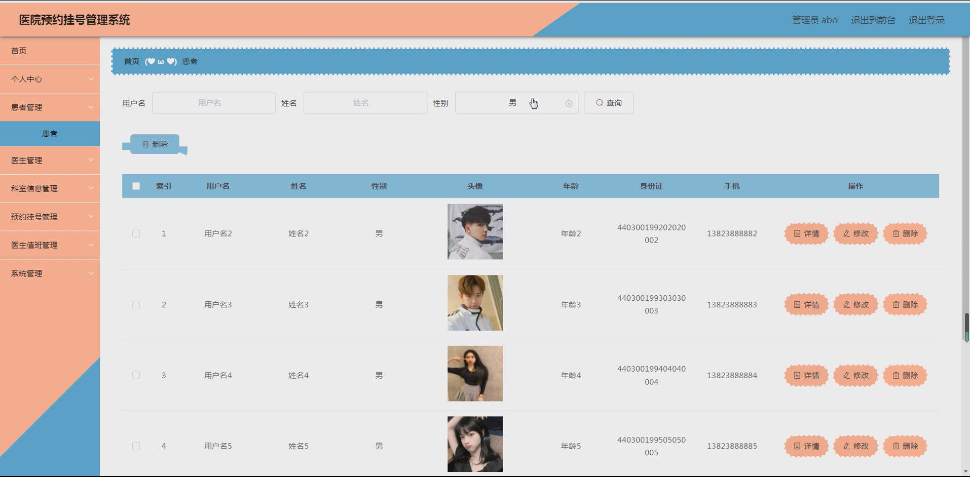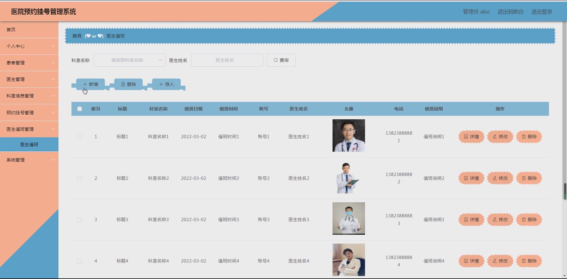 系统项目功能:患者,医生,科室信息,预约挂号,医生值班