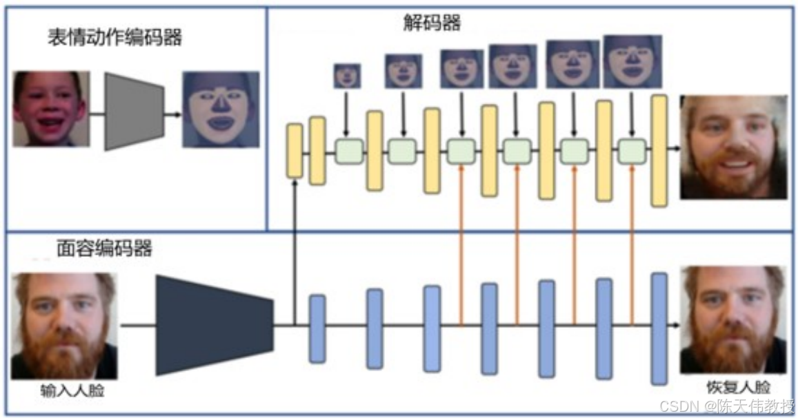 展示了一个人脸控制模型的结构。左上的"表情动作编码器"负责提取表情和动作特征,左下的"面容编码器"负责提取面部的外观特征。最后,右上的解码器将这两部分信息结合,生成带有表情和动作的合成图片或视频。