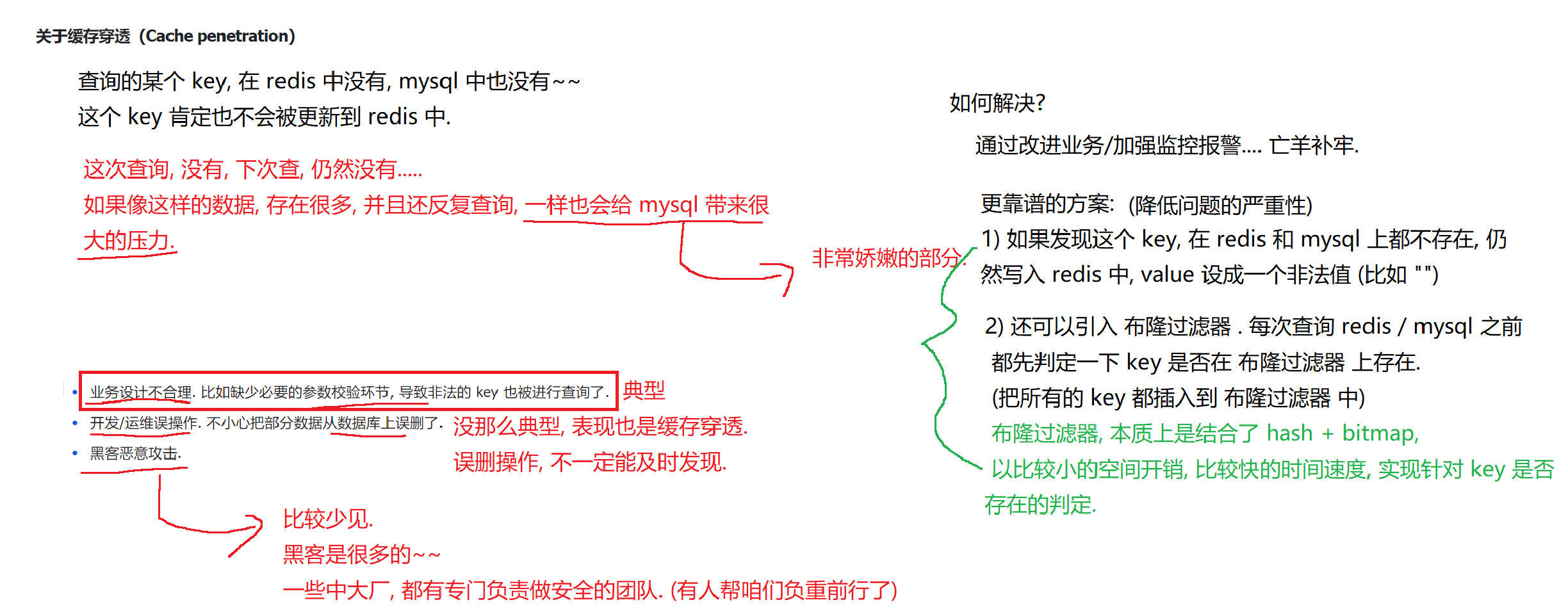 2.缓存穿透(Cache penetration)查询的某个key,在redis中没有,mysql中也没有;这个key不会被更新到redis中;