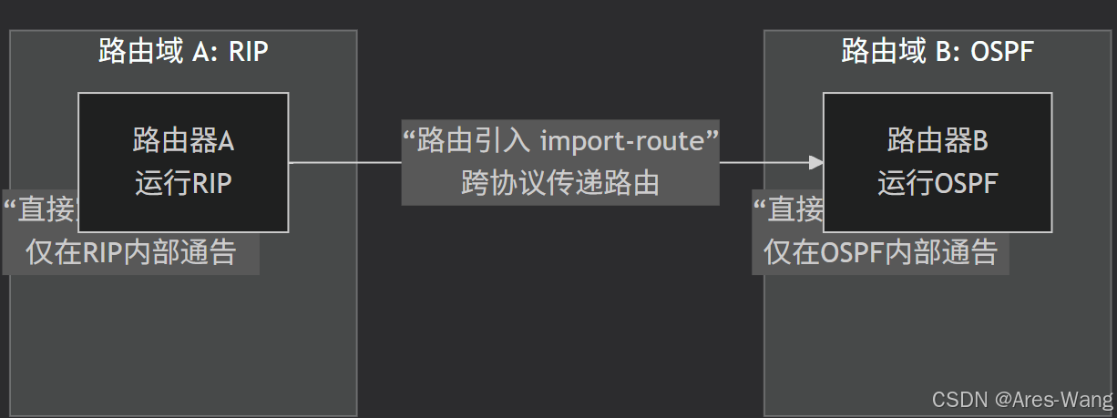 路由引入(Route Import/Redistribution)的核心功能是:让一个路由协议把自己学到的路由,共享给另一个路由协议。你可以把它想象成不同国家(不同路由协议)之间的"翻译官"和"外交官",负责把一种语言(协议)的信息,转换成另一种语言(协议),并传递给对方。
