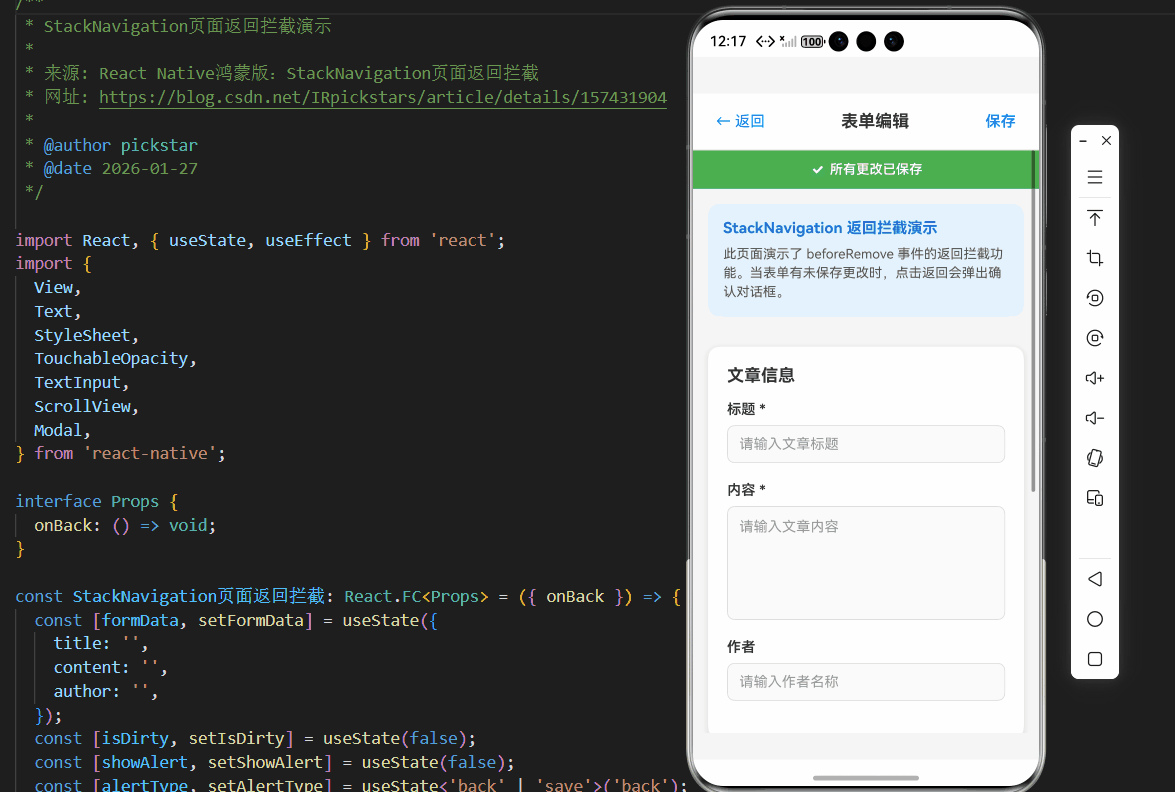 本文详细探讨了React Navigation中StackNavigation在OpenHarmony 6.0.0平台上的页面返回拦截实现。通过深入分析StackNavigation的工作原理、React Native与OpenHarmony的平台适配要点,以及beforeRemove事件的使用方法,我们了解了如何在鸿蒙平台上实现可靠的返回拦截功能。